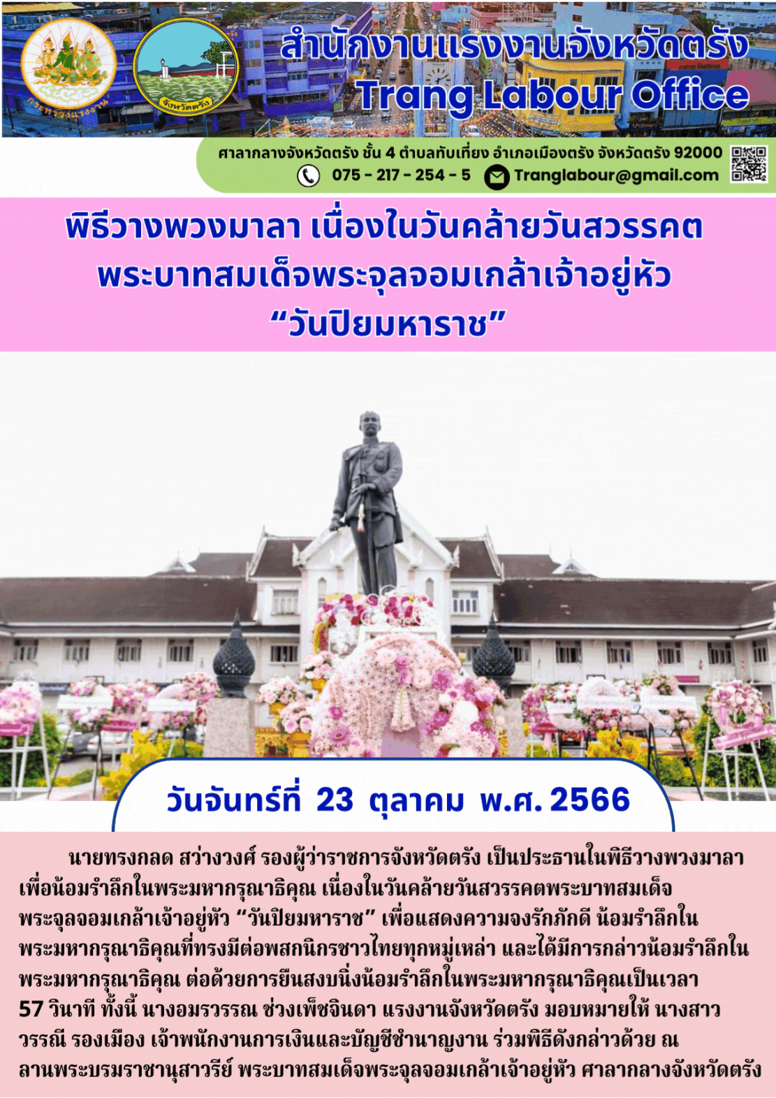 สรจ.ตรัง ร่วมพิธีวางพวงมาลา เนื่องในวันคล้ายวันสวรรคตพระบาทสมเด็จพระจุลจอมเกล้าเจ้าอยู่หัว “วันปิยมหาราช”
