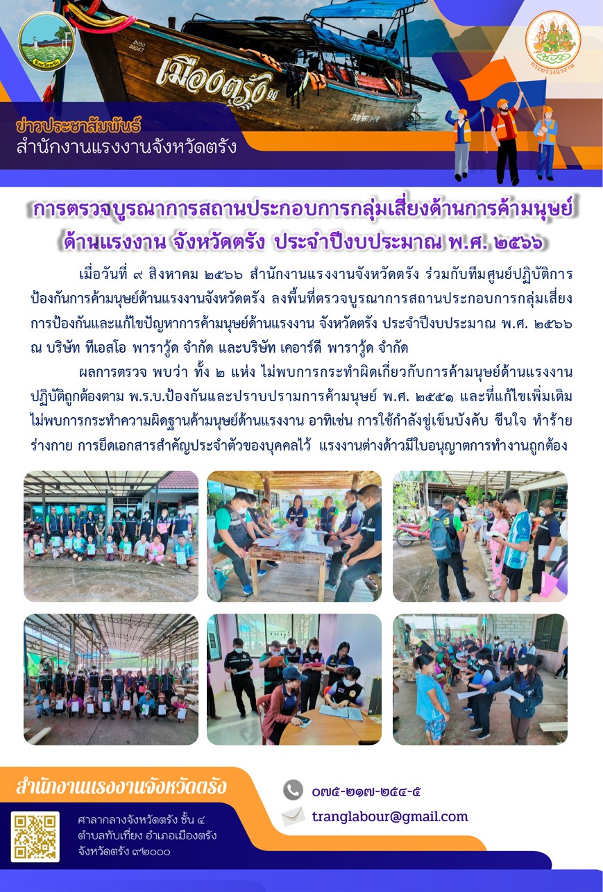 สรจ.ตรัง ลงพื้นที่ตรวจบูรณาการสถานประกอบการกลุ่มเสี่ยงการป้องกันและแก้ไขปัญหาการค้ามนุษย์ด้านแรงงาน จังหวัดตรัง ประจำปีงบประมาณ พ.ศ. 2566 ณ บริษัท ทีเอสโอ พาราวู้ด จำกัด และบริษัท เคอาร์ดี พาราวู้ด จำกัด