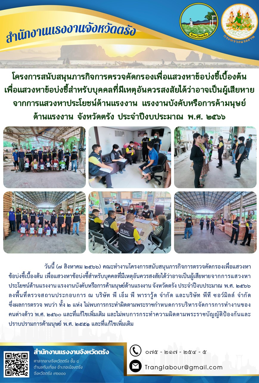 สรจ.ตรัง ลงพื้นที่ตรวจสถานประกอบการโครงการสนับสนุนภารกิจการตรวจคัดกรองเพื่อแสวงหาข้อบ่งชี้เบื้องต้น เพื่อแสวงหาข้อบ่งชี้สำหรับบุคคลที่มีเหตุอันควรสงสัยได้ว่าอาจเป็นผู้เสียหายจากการแสวงหาประโยชน์ด้านแรงงาน แรงงานบังคับหรือการค้ามนุษย์ด้านแรงงาน จังหวัดตรัง ประจำปีงบประมาณ พ.ศ. 2566 ณ บริษัท พี เอ็ม พี พาราวู้ด จำกัด และบริษัท พีที ซอว์มิลล์ จำกัด