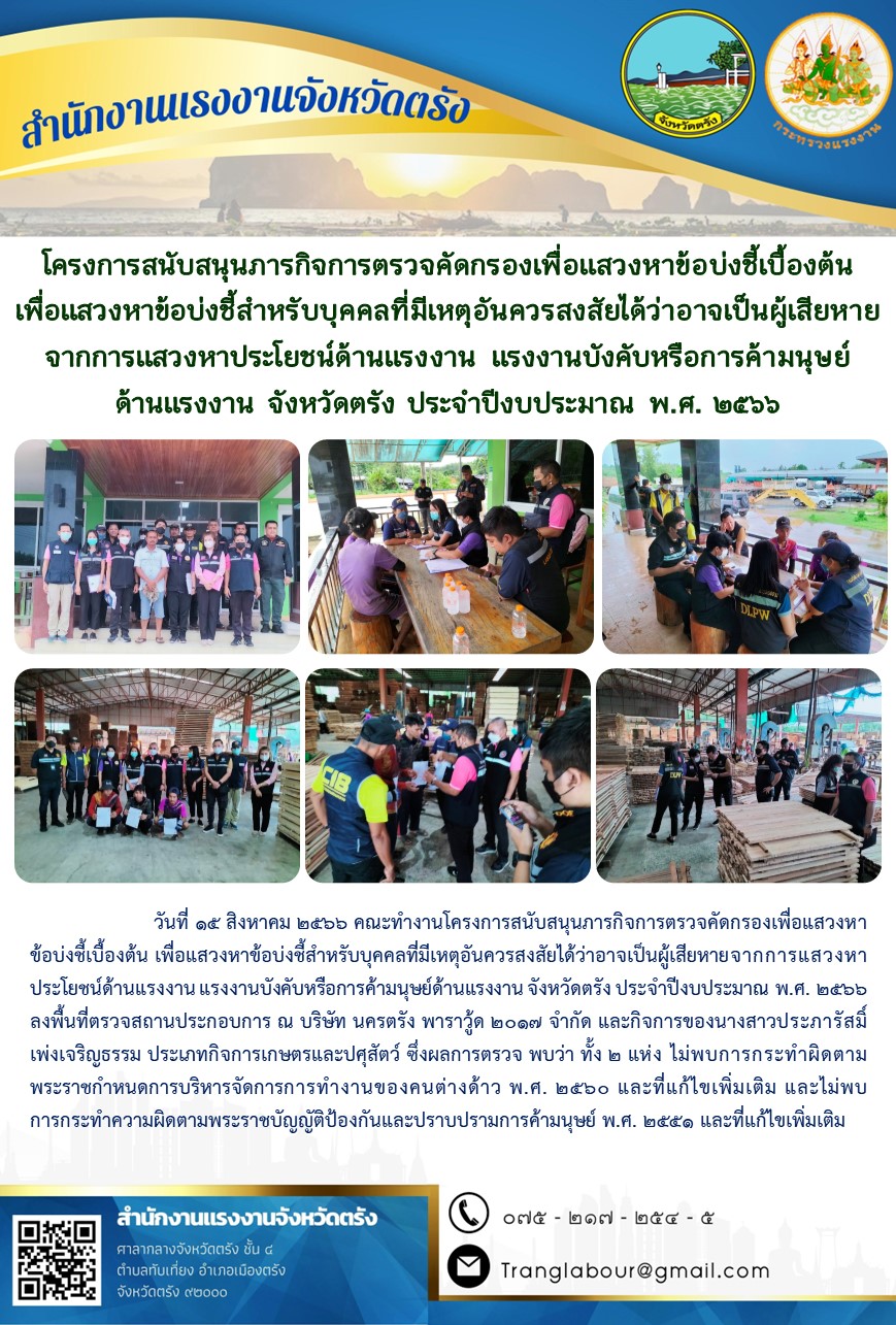 สรจ.ตรัง ลงพื้นที่ตรวจสถานประกอบการโครงการสนับสนุนภารกิจการตรวจคัดกรองเพื่อแสวงหาข้อบ่งชี้เบื้องต้น เพื่อแสวงหาข้อบ่งชี้สำหรับบุคคลที่มีเหตุอันควรสงสัยได้ว่าอาจเป็นผู้เสียหายจากการแสวงหาประโยชน์ด้านแรงงาน แรงงานบังคับหรือการค้ามนุษย์ด้านแรงงาน จังหวัดตรัง ประจำปีงบประมาณ พ.ศ. 2566