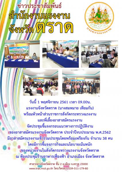 สรจ.ตราด จัดประชุมชี้แจงกรอบแนวทางการปฏิบัติงานของอาสาสมัครแรงงานจังหวัดตราด ประจำปีงบประมาณ 2562