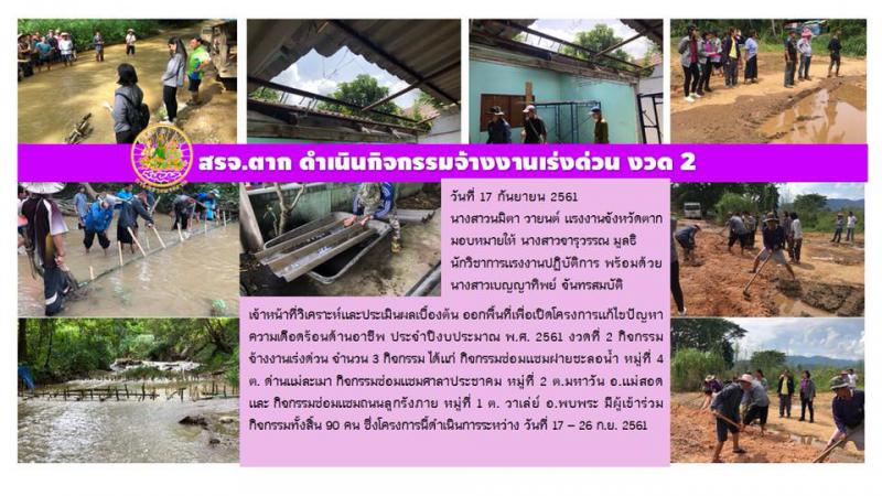 วันที่ 17 ก.ย. 2561 นางสาวนมิตา วายนต์ แรงงานจังหวัดตาก มอบหมายให้ นางสาวจารุวรรณ มูลธิ นักวิชาการแรงงานปฏิบัติการ พร้อมด้วย นางสาวเบญญาทิพย์ จันทรสมบัติ เจ้าหน้าที่วิเคราะห์และประเมินผลเบื้องต้น ออกพื้นที่ เพื่อเปิดโครงการแก้ไขปัญหาความเดือดร้อนด้านอาชีพ ประจำปีงบประมาณ พ.ศ. 2561 งวดที่2 กิจกรรมจ้างงานเร่งด่วน 3 กิจกรรม ได้แก่ กิจกรรมซ่อมแซมฝายชะลอน้ำ หมู่ที่4 ต.ด่านแม่ละเมา กิจกรรมซ่อมแซมศาลาประชาคม หมู่ที่2 ต.มหาวัน อ.แม่สอด และกิจกรรมซ่อมแซมถนนลูกรังภาย หมู่ที่ 1 ต.วาเลย์ อ.พบพระ มีผู้เข้าร่วมกิจกรรมทั้งสิ้น 90 คน ซึ่งโครงการนี้ดำเนินการระหว่างวันที่ 17-26 ก.ย. 2561