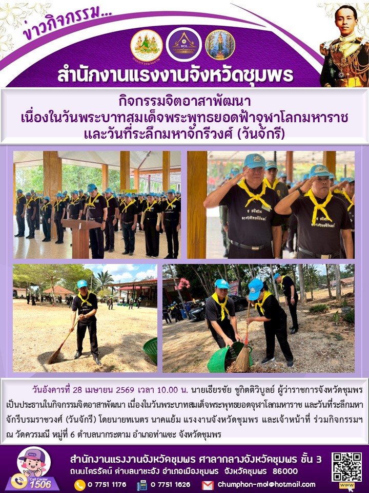 แรงงานจังหวัดชุมพร พร้อมด้วยเจ้าหน้า ร่วมกิจกรรมจิตอาสาพัฒนา เนื่องในวันพระบาทสมเด็จพระพุทธยอดฟ้าจุฬาโลกมหาราช และวันที่ระลึกมหาจักรีวงศ์ (วันจักรี)