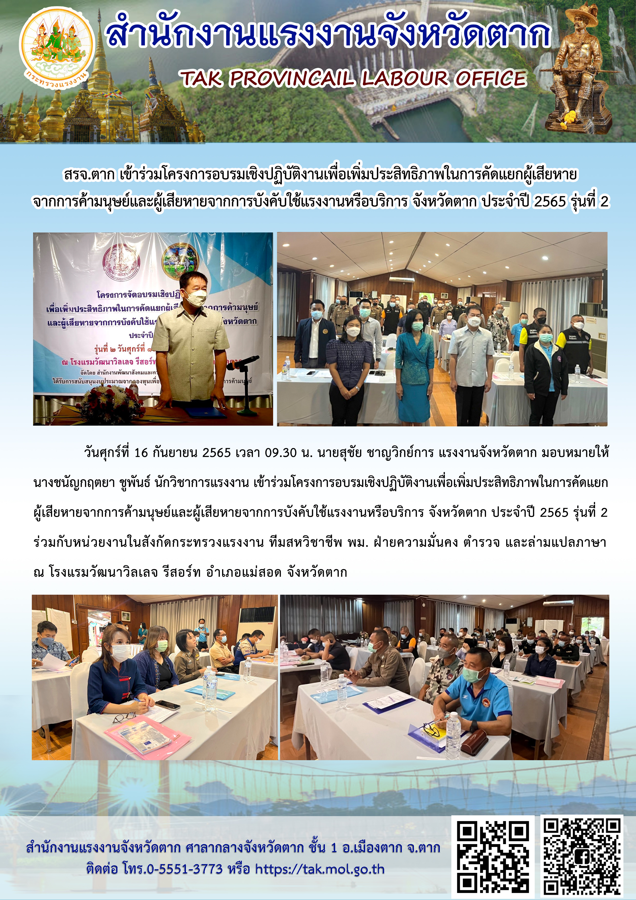 สรจ.ตาก เข้าร่วมโครงการอบรมเชิงปฏิบัติงานเพื่อเพิ่มประสิทธิภาพในการคัดแยกผู้เสียหายจากการค้ามนุษย์และผู้เสียหายจากการบังคับใช้แรงงานหรือบริการ จังหวัดตาก ประจำปี 2565 รุ่นที่ 2