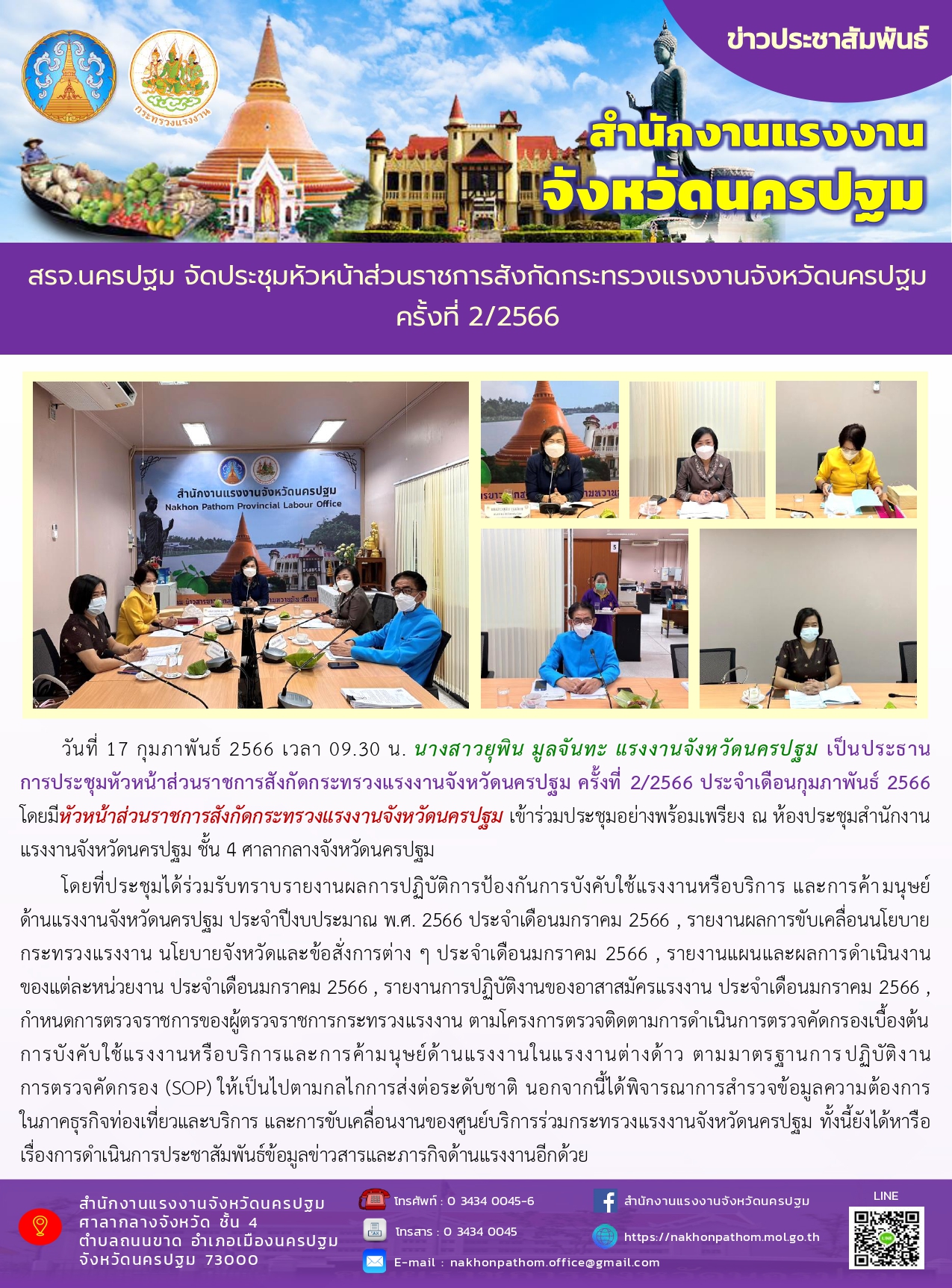 สรจ.นครปฐม จัดประชุมหัวหน้าส่วนราชการสังกัดกระทรวงแรงงานจังหวัดนครปฐม ครั้งที่ 2/2566