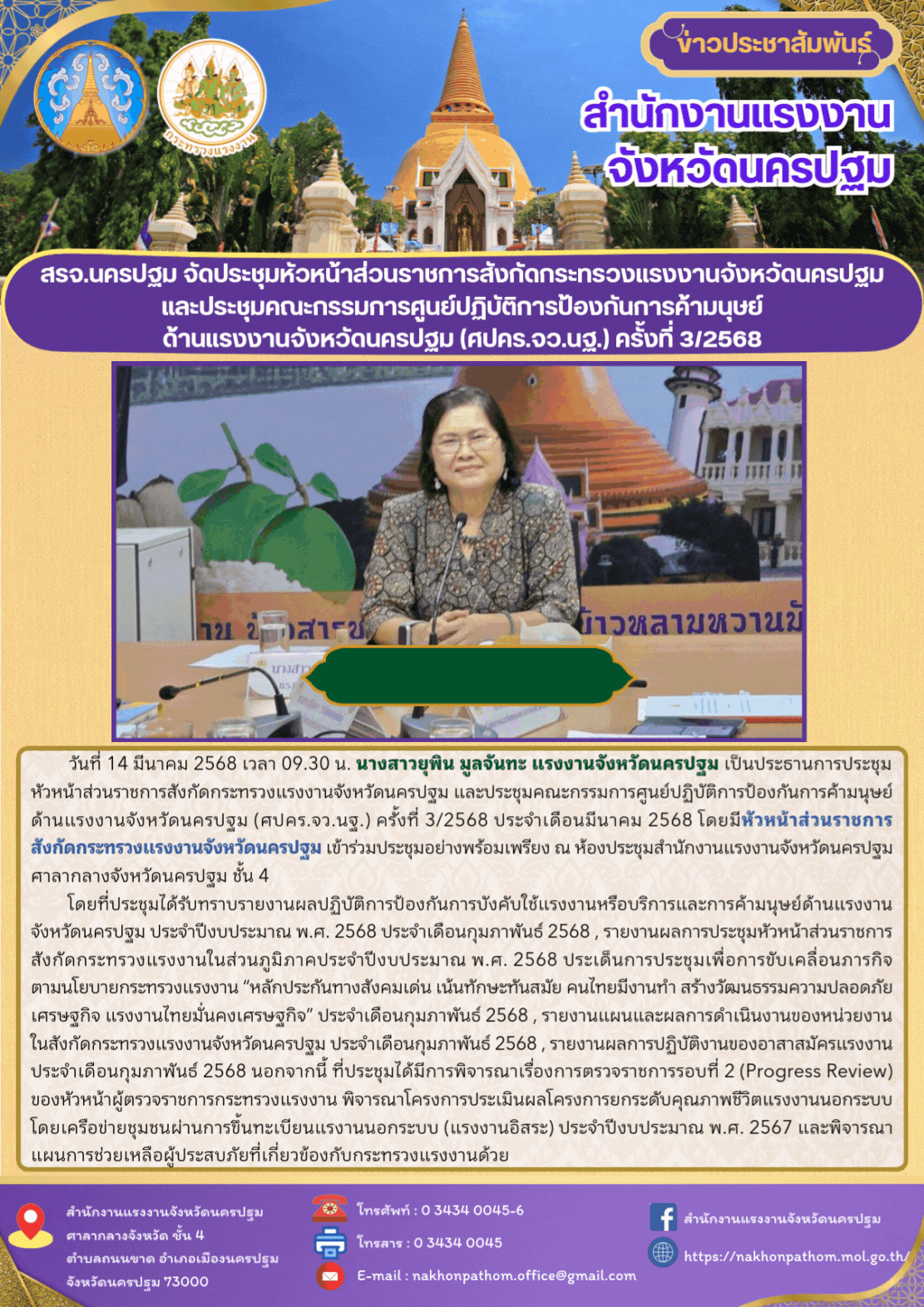 สรจ.นครปฐม จัดประชุมหัวหน้าส่วนราชการสังกัดกระทรวงแรงงานจังหวัดนครปฐม และประชุมคณะกรรมการศูนย์ปฏิบัติการป้องกันการค้ามนุษย์ด้านแรงงานจังหวัดนครปฐม (ศปคร.จว.นฐ.) ครั้งที่ 3/2568