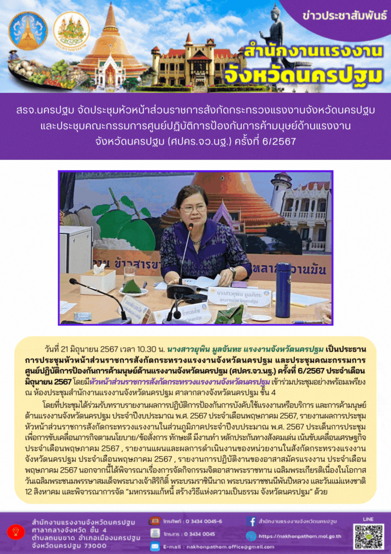 สรจ.นครปฐม จัดประชุมหัวหน้าส่วนราชการสังกัดกระทรวงแรงงานจังหวัดนครปฐม และประชุมคณะกรรมการศูนย์ปฏิบัติการป้องกันการค้ามนุษย์ด้านแรงงานจังหวัดนครปฐม (ศปคร.จว.นฐ.) ครั้งที่ 6/2567