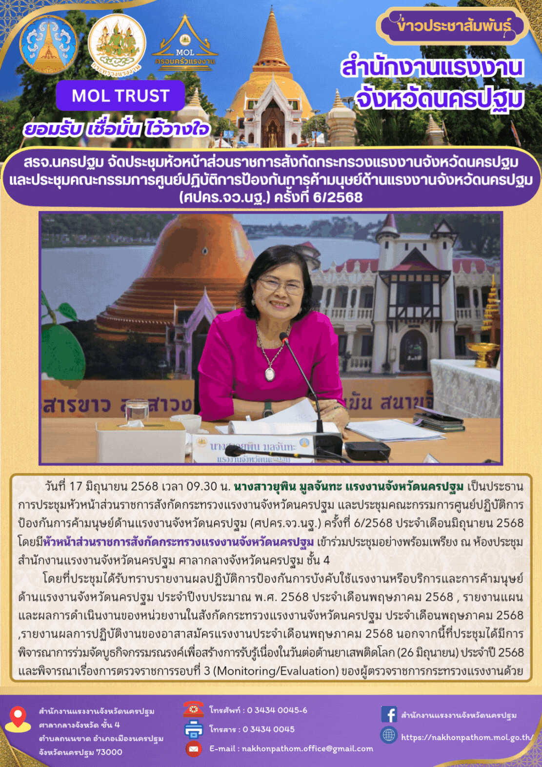 สรจ.นครปฐม จัดประชุมหัวหน้าส่วนราชการสังกัดกระทรวงแรงงานจังหวัดนครปฐม และประชุมคณะกรรมการศูนย์ปฏิบัติการป้องกันการค้ามนุษย์ด้านแรงงานจังหวัดนครปฐม (ศปคร.จว.นฐ.) ครั้งที่ 6/2568