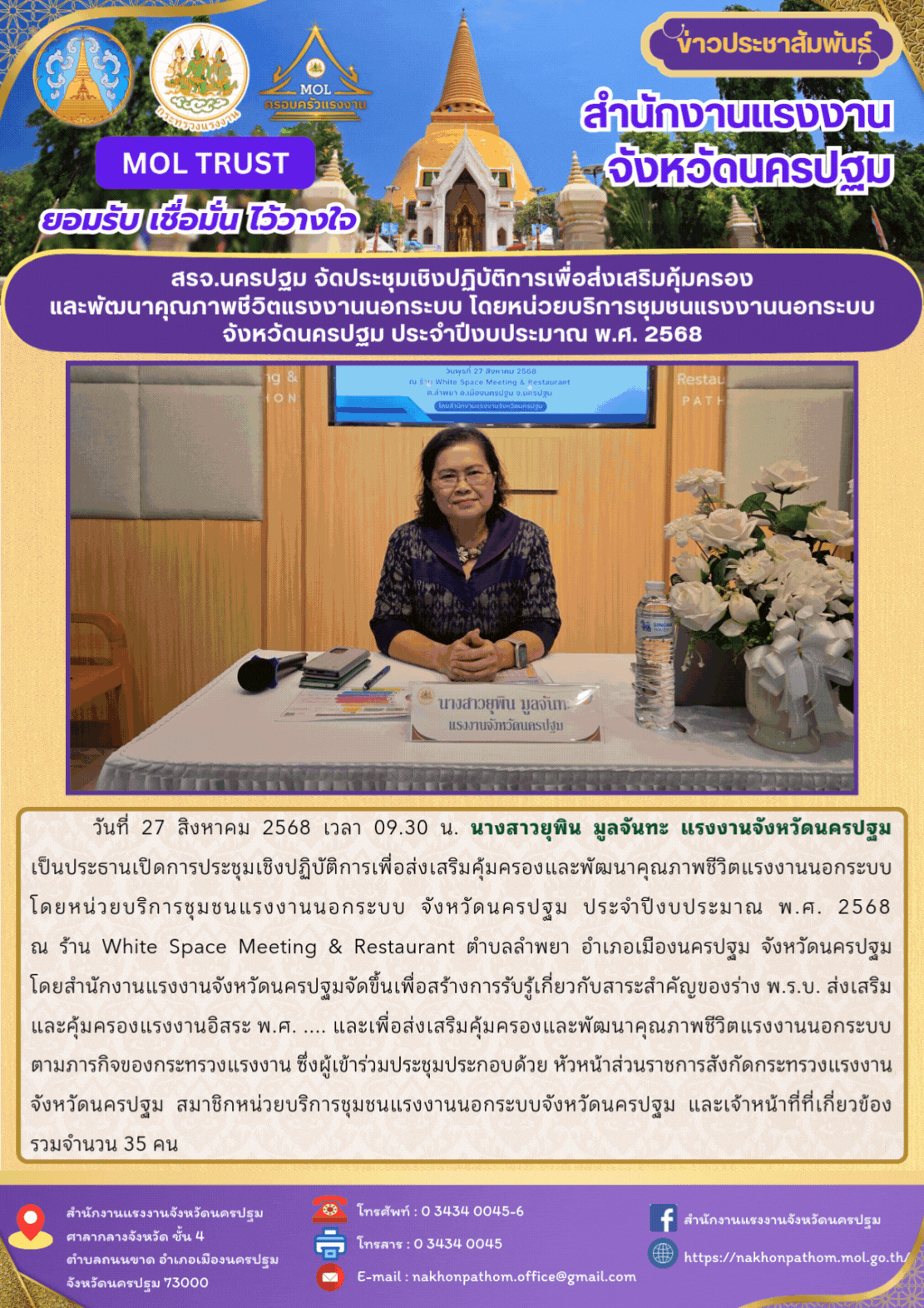 สรจ.นครปฐม จัดประชุมเชิงปฏิบัติการเพื่อส่งเสริมคุ้มครองและพัฒนาคุณภาพชีวิตแรงงานนอกระบบ โดยหน่วยบริการชุมชนแรงงานนอกระบบ จังหวัดนครปฐม ประจำปีงบประมาณ พ.ศ. 2568