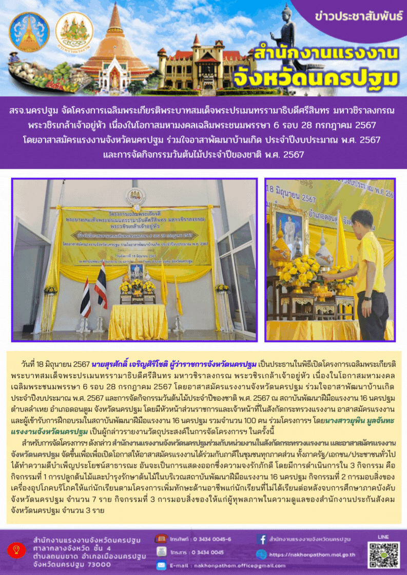 สรจ.นครปฐม จัดโครงการเฉลิมพระเกียรติพระบาทสมเด็จพระปรเมนทรรามาธิบดีศรีสินทร มหาวชิราลงกรณ พระวชิรเกล้าเจ้าอยู่หัว เนื่องในโอกาสมหามงคลเฉลิมพระชนมพรรษา 6 รอบ 28 กรกฎาคม 2567 โดยอาสาสมัครแรงงานจังหวัดนครปฐม ร่วมใจอาสาพัฒนาบ้านเกิด ประจำปีงบประมาณ พ.ศ. 2567 และการจัดกิจกรรมวันต้นไม้ประจำปีของชาติ พ.ศ. 2567