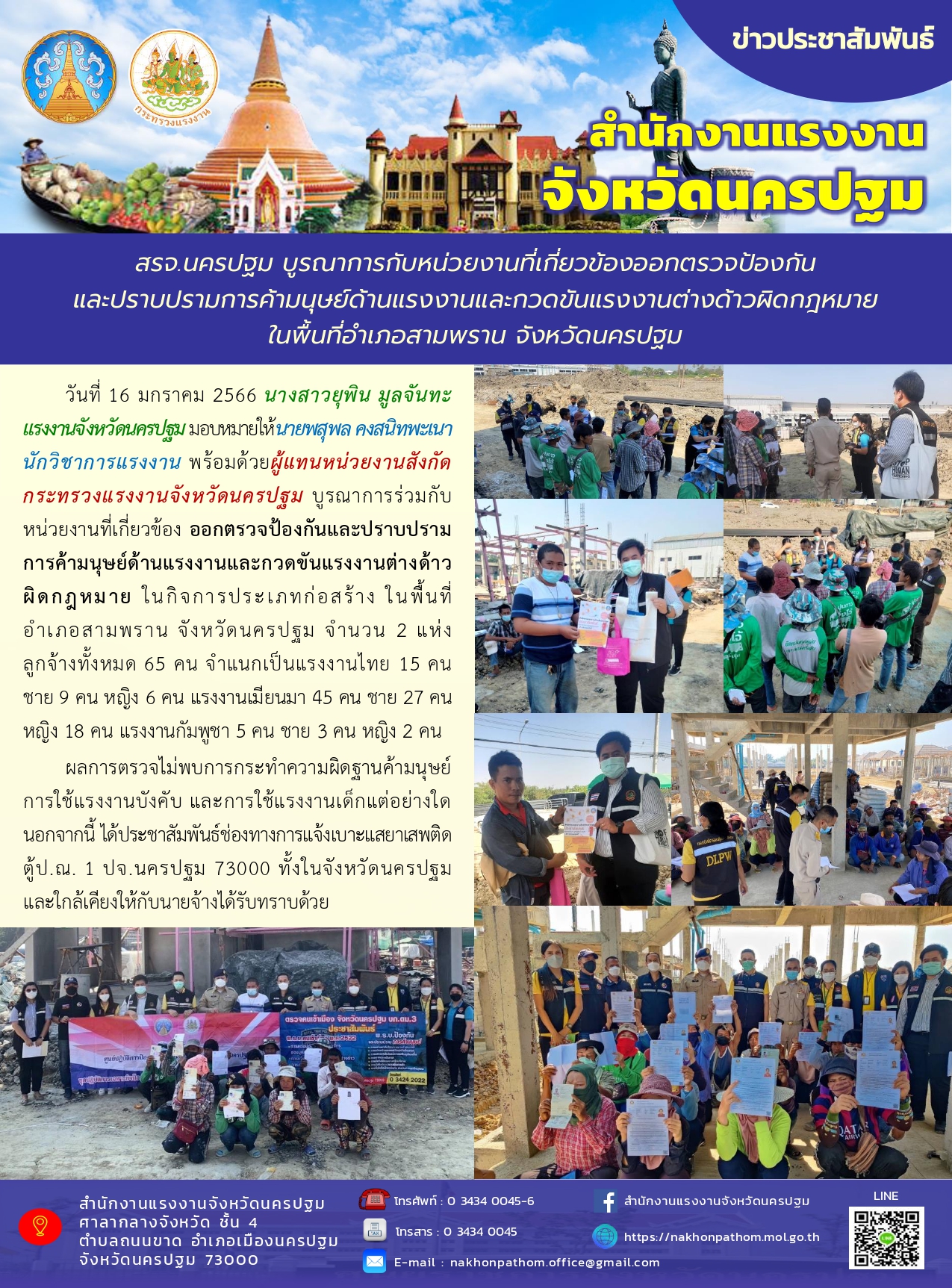 สรจ.นครปฐม บูรณาการกับหน่วยงานที่เกี่ยวข้องออกตรวจป้องกันและปราบปรามการค้ามนุษย์ด้านแรงงานและกวดขันแรงงานต่างด้าวผิดกฎหมาย ในพื้นที่อำเภอสามพราน จังหวัดนครปฐม