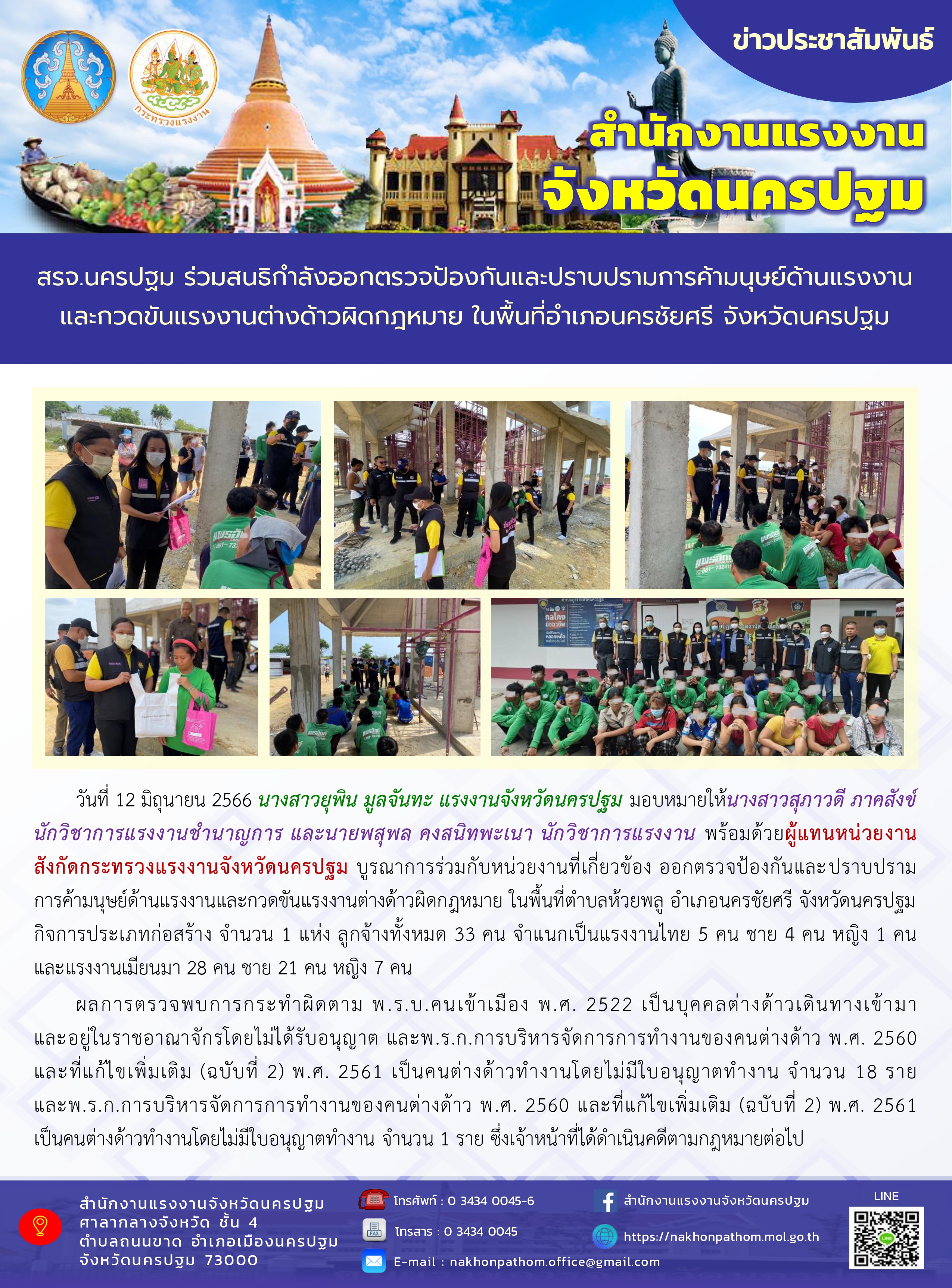 สรจ.นครปฐม บูรณาการร่วมกับหน่วยงานที่เกี่ยวข้องออกตรวจป้องกันและปราบปรามการค้ามนุษย์ด้านแรงงานและกวดขันแรงงานต่างด้าวผิดกฎหมาย ในพื้นที่อำเภอนครชัยศรี จังหวัดนครปฐม