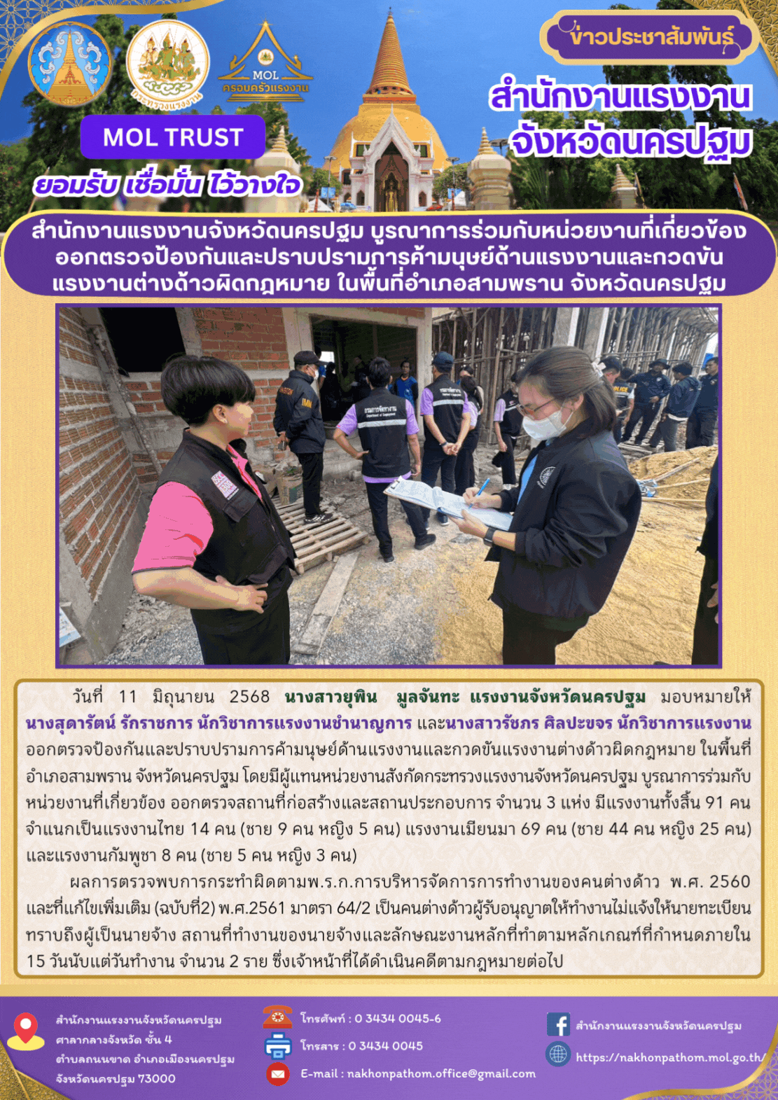 สรจ.นครปฐม บูรณาการร่วมกับหน่วยงานที่เกี่ยวข้องออกตรวจป้องกันและปราบปรามการค้ามนุษย์ด้านแรงงานและกวดขันแรงงานต่างด้าวผิดกฎหมาย ในพื้นที่อำเภอสามพราน จังหวัดนครปฐม