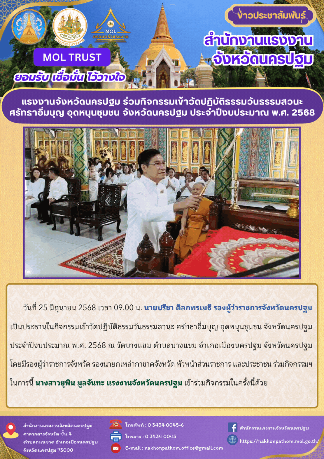 สรจ.นครปฐม ร่วมกิจกรรมเข้าวัดปฏิบัติธรรมวันธรรมสวนะ ศรัทธาอิ่มบุญ อุดหนุนชุมชน จังหวัดนครปฐม ประจำปีงบประมาณ พ.ศ. 2568