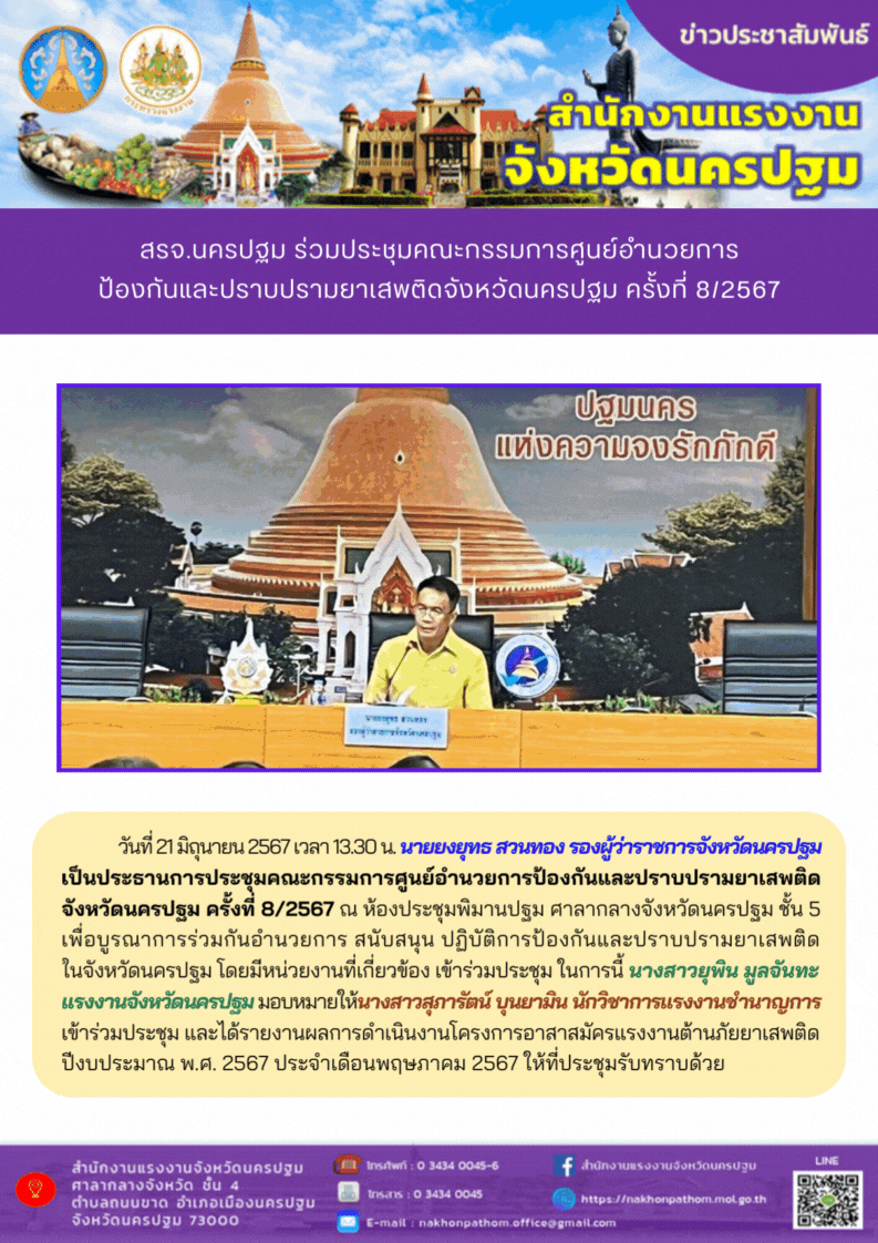 สรจ.นครปฐม ร่วมประชุมคณะกรรมการศูนย์อำนวยการป้องกันและปราบปรามยาเสพติดจังหวัดนครปฐม ครั้งที่ 8/2567