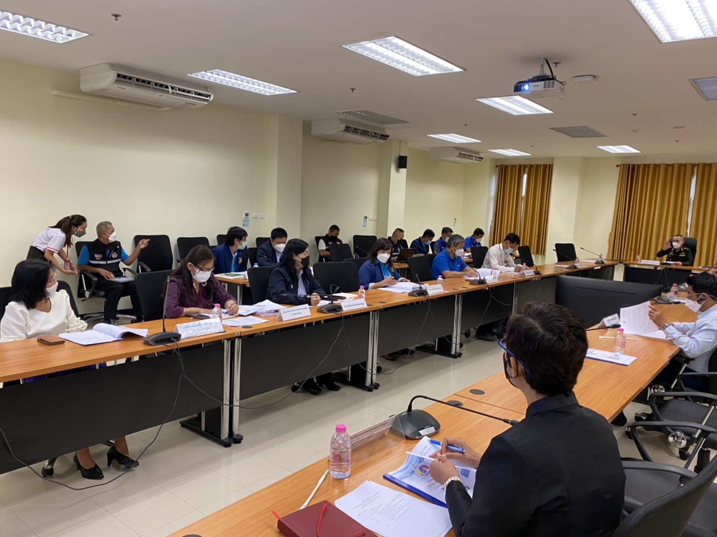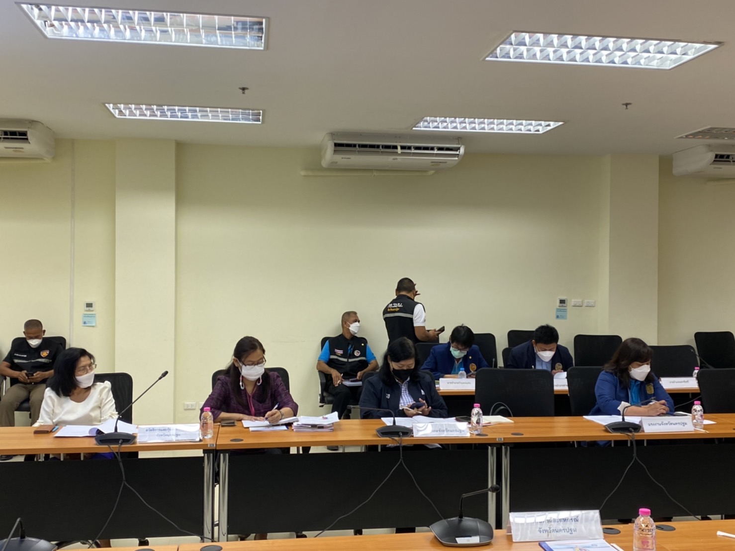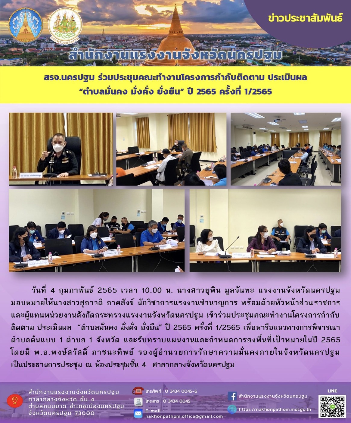วันที่ 4 กุมภาพันธ์ 2565 เวลา 10.00 น. นางสาวยุพิน มูลจันทะ แรงงานจังหวัดนครปฐม มอบหมายให้นางสาวสุภาวดี ภาคสังข์ นักวิชาการแรงงานชำนาญการ พร้อมด้วยหัวหน้าส่วนราชการและผู้แทนหน่วยงานสังกัดกระทรวงแรงงานจังหวัดนครปฐม เข้าร่วมประชุมคณะทำงานโครงการกำกับติดตาม ประเมินผล “ตำบลมั่นคง มั่งคั่ง ยั่งยืน” ปี 2565 ครั้งที่ 1/2565 เพื่อหารือแนวทางการพิจารณาตำบลต้นแบบ 1 ตำบล 1 จังหวัด และรับทราบแผนงานและกำหนดการลงพื้นที่เป้าหมายในปี 2565 โดยมี พ.อ.พงษ์สวัสดิ์ ภาชนะทิพย์ รองผู้อำนวยการรักษาความมั่นคงภายในจังหวัดนครปฐม เป็นประธานการประชุม ณ ห้องประชุมชั้น 4 ศาลากลางจังหวัดนครปฐม