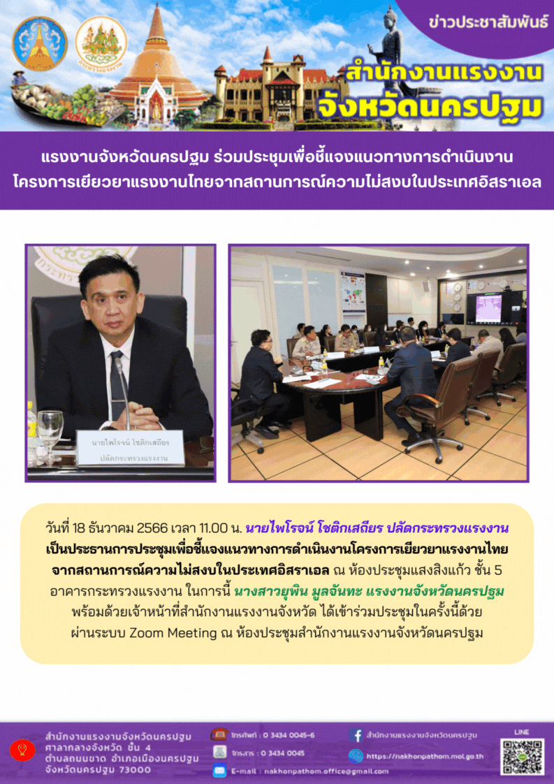 สรจ.นครปฐม ร่วมประชุมเพื่อชี้แจงแนวทางการดำเนินงานโครงการเยียวยาแรงงานไทยจากสถานการณ์ความไม่สงบในประเทศอิสราเอล
