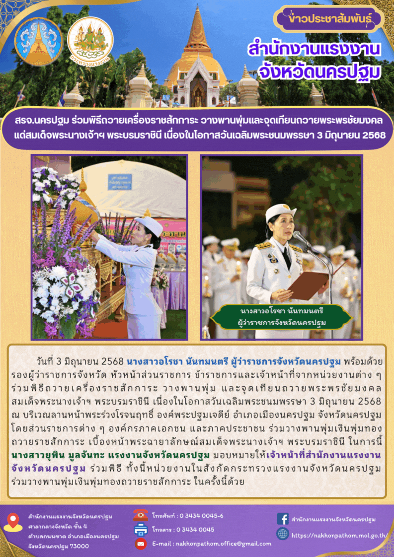 สรจ.นครปฐม ร่วมพิธีถวายเครื่องราชสักการะ วางพานพุ่ม และจุดเทียนถวายพระพรชัยมงคล แด่สมเด็จพระนางเจ้าฯ พระบรมราชินี เนื่องในโอกาสวันเฉลิมพระชนมพรรษา 3 มิถุนายน 2568
