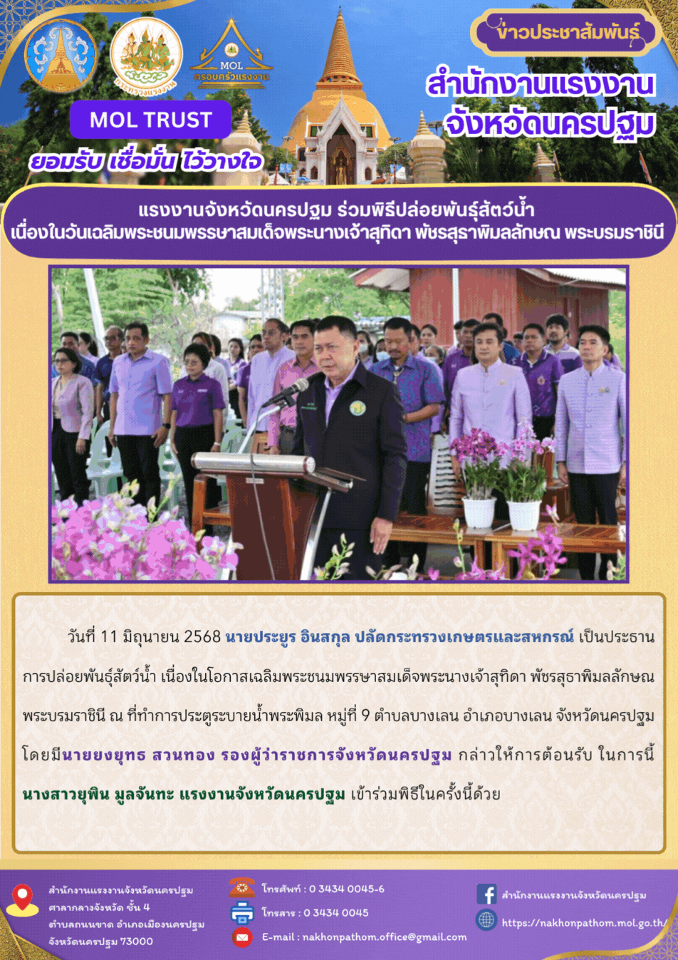 สรจ.นครปฐม ร่วมพิธีปล่อยพันธุ์สัตว์น้ำ เนื่องในวันเฉลิมพระชนมพรรษาสมเด็จพระนางเจ้าสุทิดา พัชรสุธาพิมลลักษณ พระบรมราชินี