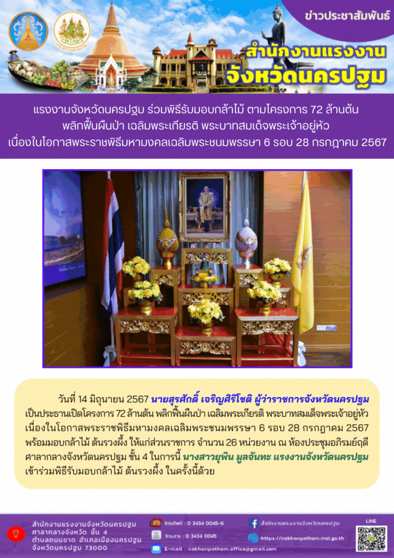 สรจ.นครปฐม ร่วมพิธีรับมอบกล้าไม้ ตามโครงการ 72 ล้านต้น พลิกฟื้นผืนป่า เฉลิมพระเกียรติ พระบาทสมเด็จพระเจ้าอยู่หัว เนื่องในโอกาสพระราชพิธีมหามงคลเฉลิมพระชนมพรรษา 6 รอบ 28 กรกฎาคม 2567