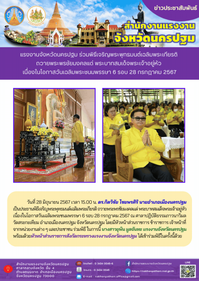 สรจ.นครปฐม ร่วมพิธีเจริญพระพุทธมนต์เฉลิมพระเกียรติ ถวายพระพรชัยมงคลแด่ พระบาทสมเด็จพระเจ้าอยู่หัว เนื่องในโอกาสวันเฉลิมพระชนมพรรษา 6 รอบ 28 กรกฎาคม 2567