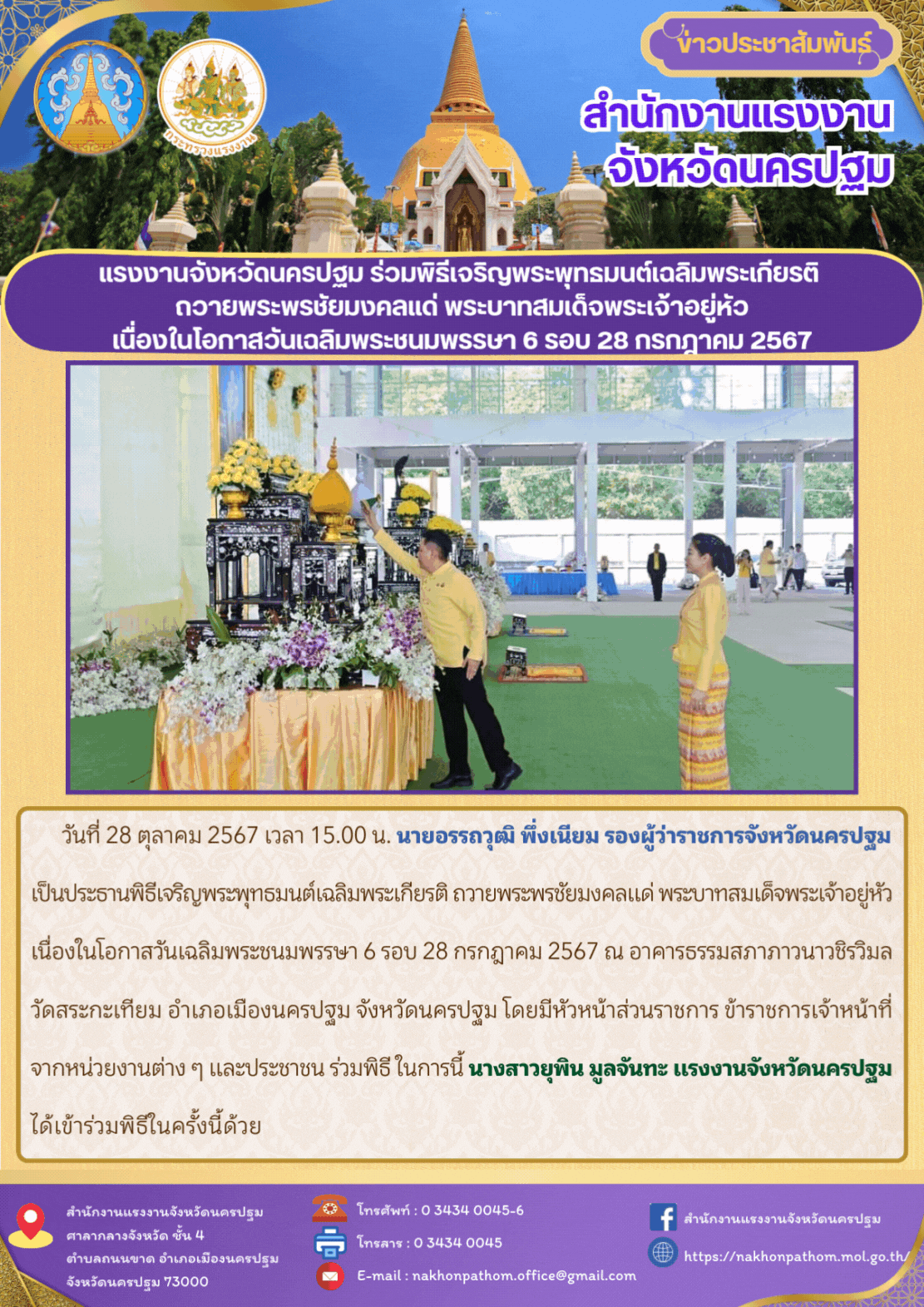 สรจ.นครปฐม ร่วมพิธีเจริญพระพุทธมนต์เฉลิมพระเกียรติ ถวายพระพรชัยมงคลแด่ พระบาทสมเด็จพระเจ้าอยู่หัว เนื่องในโอกาสวันเฉลิมพระชนมพรรษา 6 รอบ 28 กรกฎาคม 2567