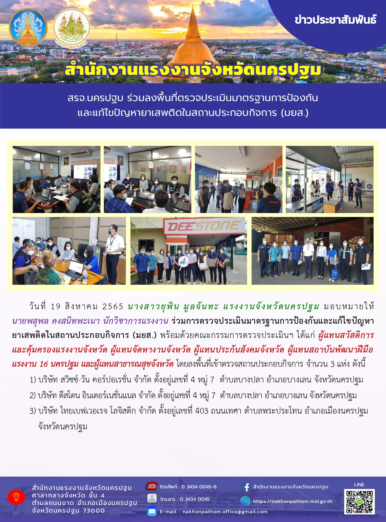 สรจ.นครปฐม ร่วมลงพื้นที่ตรวจประเมินมาตรฐานการป้องกันและแก้ไขปัญหายาเสพติดในสถานประกอบกิจการ (มยส.)