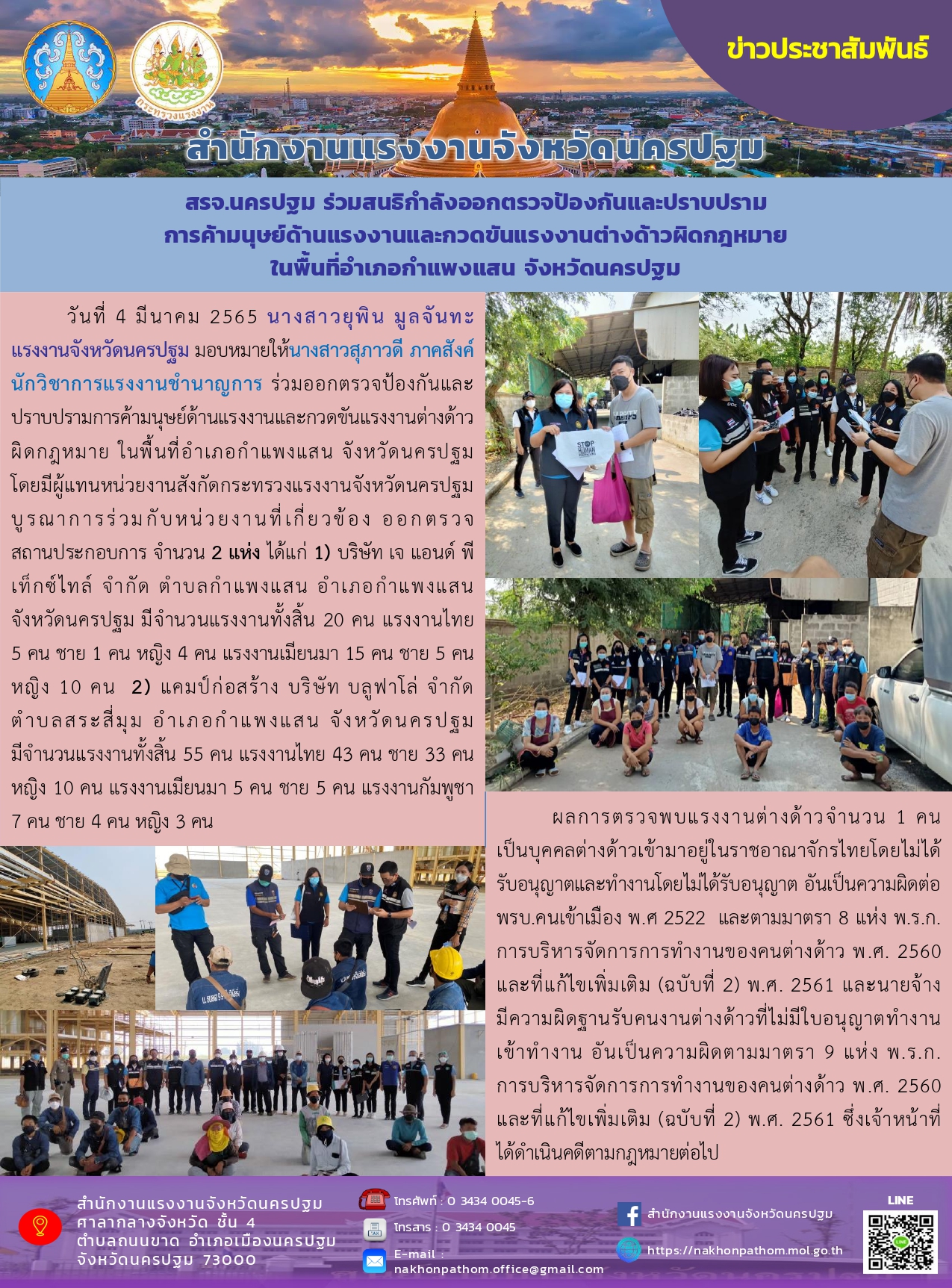 สรจ.นครปฐม ร่วมสนธิกำลังออกตรวจป้องกันและปราบปรามการค้ามนุษย์ด้านแรงงานและกวดขันแรงงานต่างด้าวผิดกฎหมาย ในพื้นที่อำเภอกำแพงแสน จังหวัดนครปฐม
