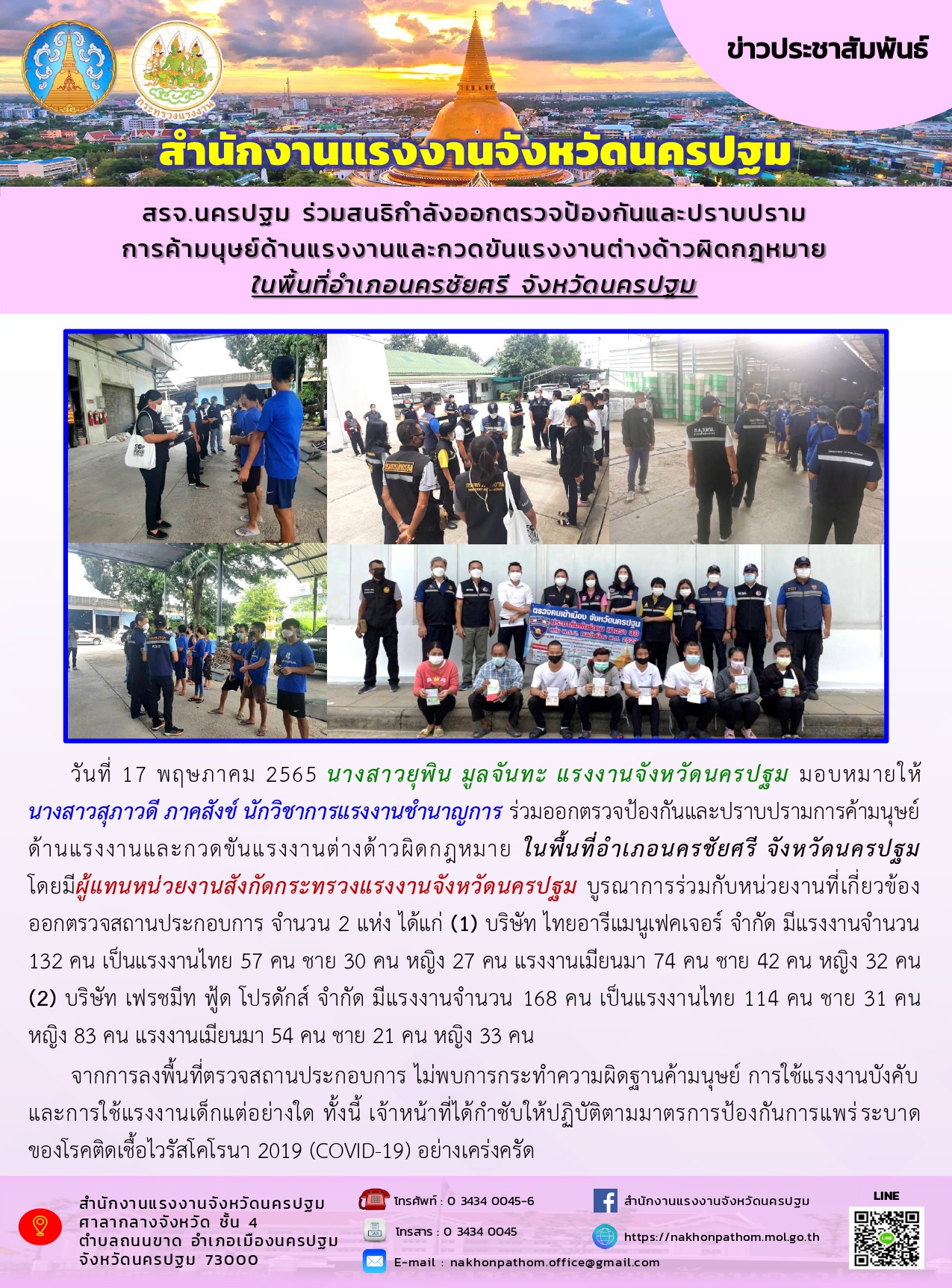 สรจ.นครปฐม ร่วมสนธิกำลังออกตรวจป้องกันและปราบปรามการค้ามนุษย์ด้านแรงงานและกวดขันแรงงานต่างด้าวผิดกฎหมาย ในพื้นที่อำเภอนครชัยศรี จังหวัดนครปฐม