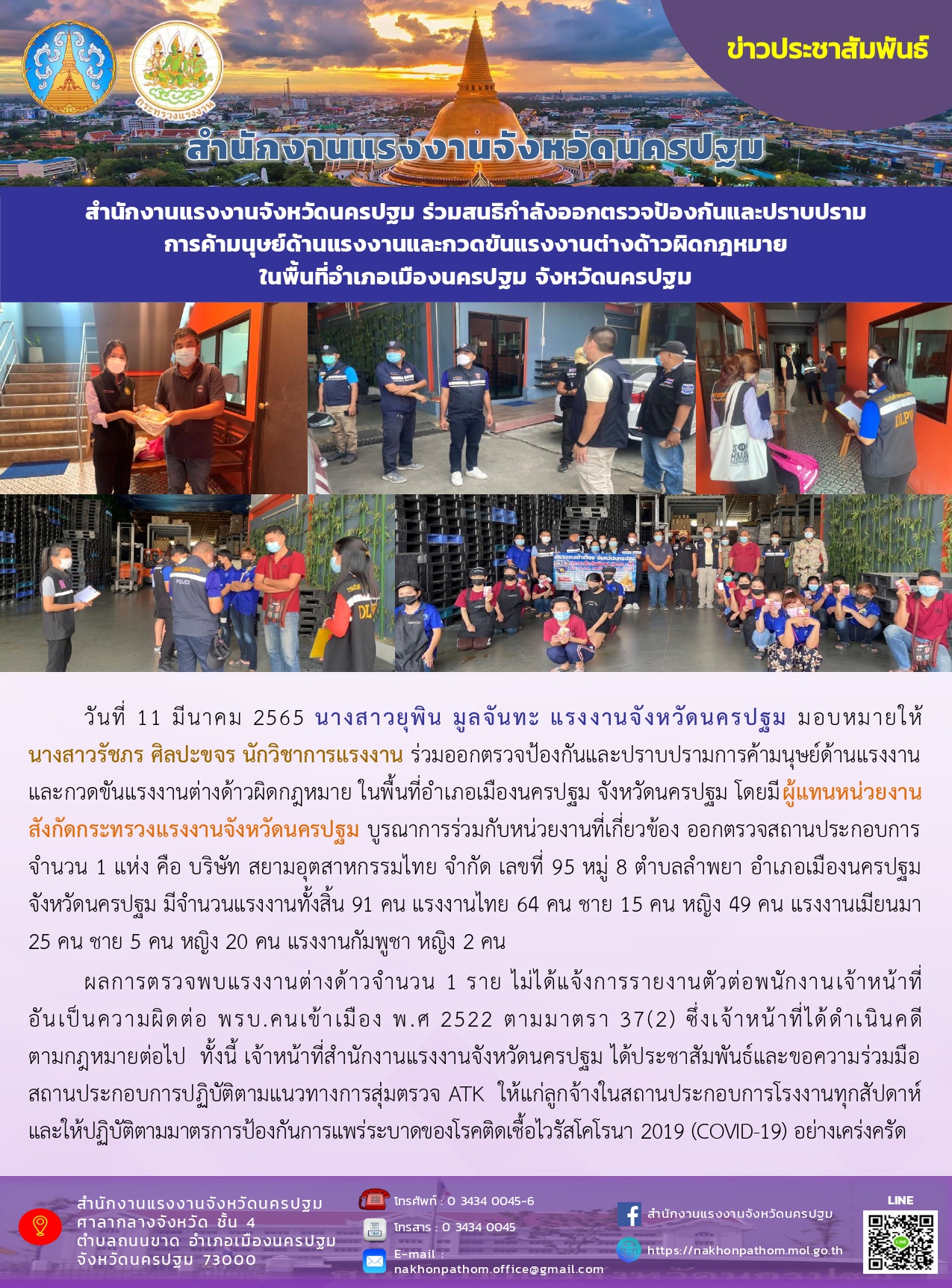 สรจ.นครปฐม ร่วมสนธิกำลังออกตรวจป้องกันและปราบปรามการค้ามนุษย์ด้านแรงงานและกวดขันแรงงานต่างด้าวผิดกฎหมาย ในพื้นที่อำเภอเมืองนครปฐม จังหวัดนครปฐม