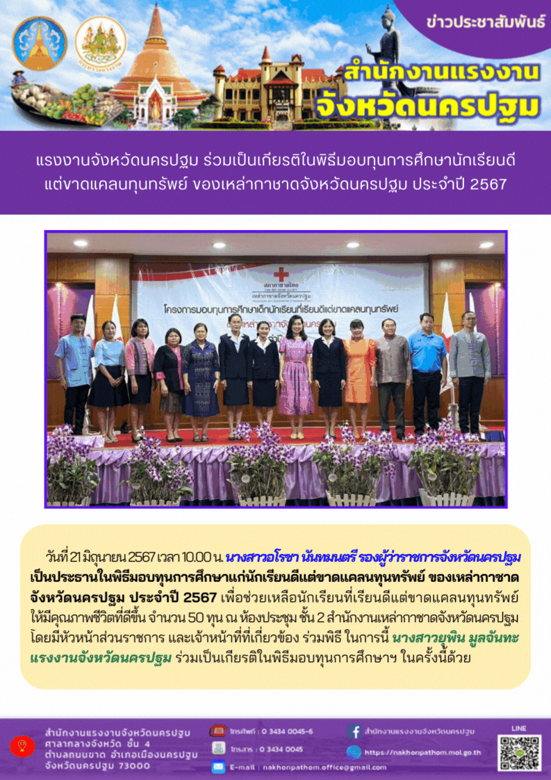 สรจ.นครปฐม ร่วมเป็นเกียรติในพิธีมอบทุนการศึกษานักเรียนดีแต่ขาดแคลนทุนทรัพย์ ของเหล่ากาชาดจังหวัดนครปฐม ประจำปี 2567