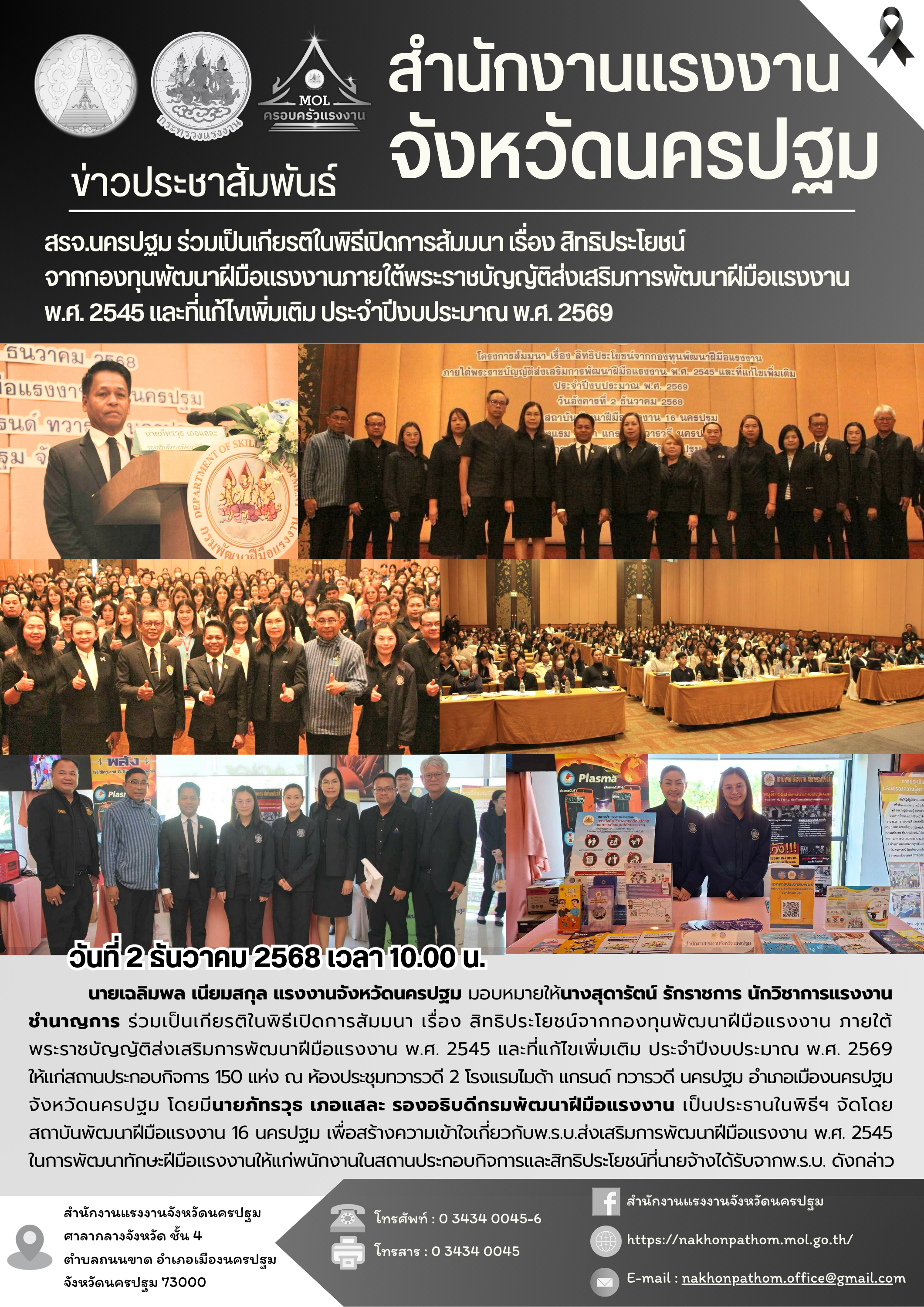 สรจ.นครปฐม ร่วมเป็นเกียรติในพิธีเปิดการสัมมนา เรื่อง สิทธิประโยชน์จากกองทุนพัฒนาฝีมือแรงงานภายใต้พระราชบัญญัติส่งเสริมการพัฒนาฝีมือแรงงาน พ.ศ. 2545 และที่แก้ไขเพิ่มเติม ประจำปีงบประมาณ พ.ศ. 2569