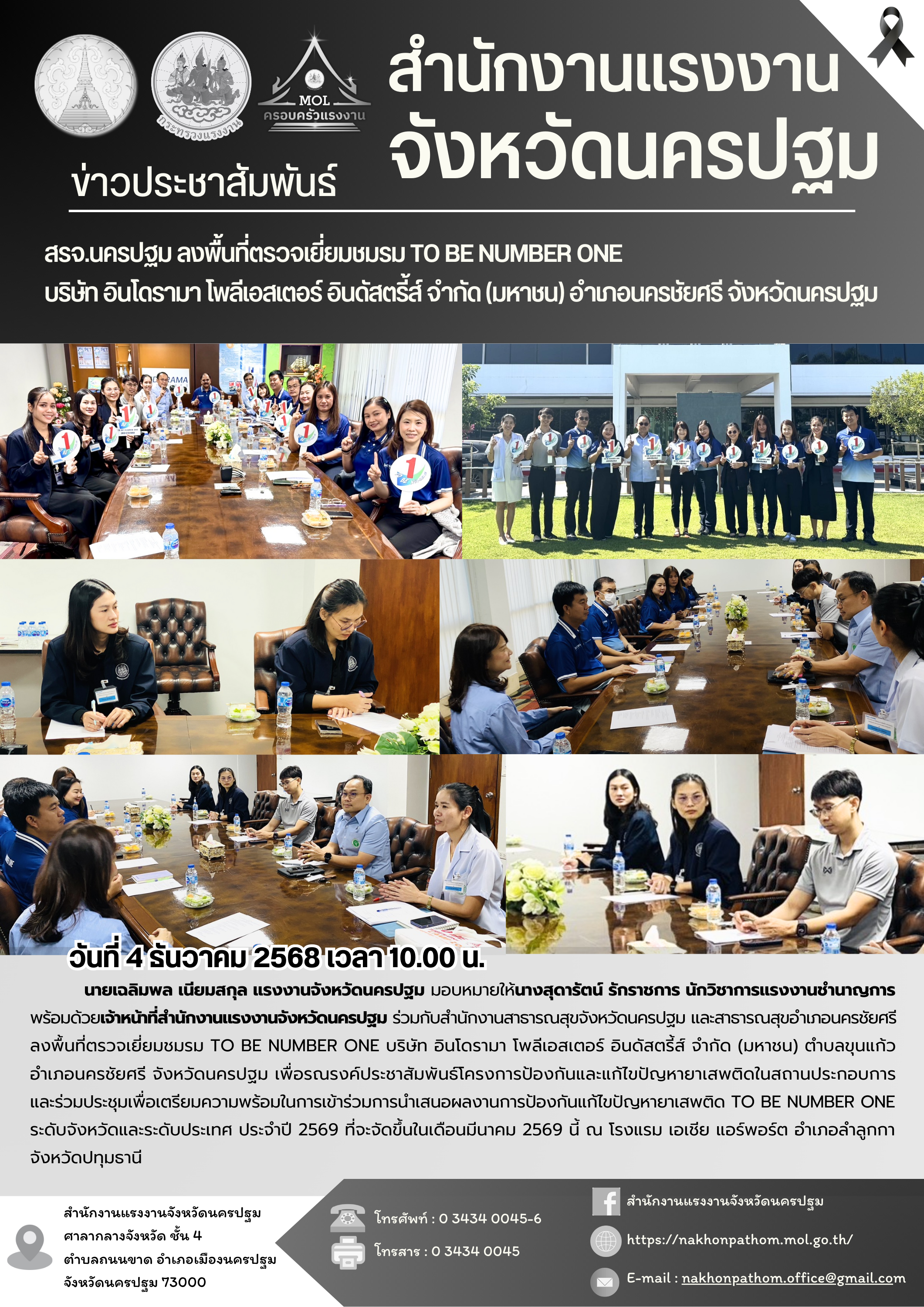สรจ.นครปฐม ลงพื้นที่ตรวจเยี่ยมชมรม TO BE NUMBER ONE บริษัท อินโดรามา โพลีเอสเตอร์ อินดัสตรี้ส์ จำกัด (มหาชน) อำเภอนครชัยศรี จังหวัดนครปฐม