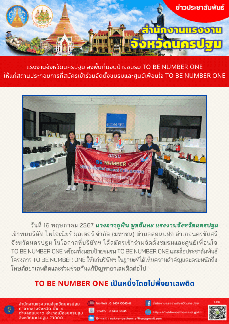 สรจ.นครปฐม ลงพื้นที่มอบป้ายชมรม TO BE NUMBER ONE ให้แก่สถานประกอบการที่สมัครเข้าร่วมจัดตั้งชมรมและศูนย์เพื่อนใจ TO BE NUMBER ONE