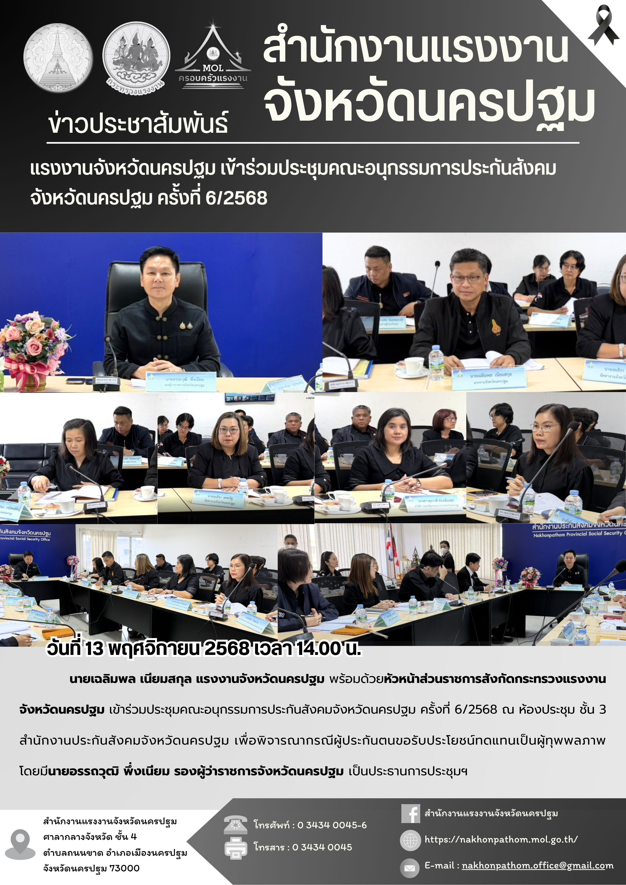 สรจ.นครปฐม เข้าร่วมประชุมคณะอนุกรรมการประกันสังคมจังหวัดนครปฐม ครั้งที่ 6/2568