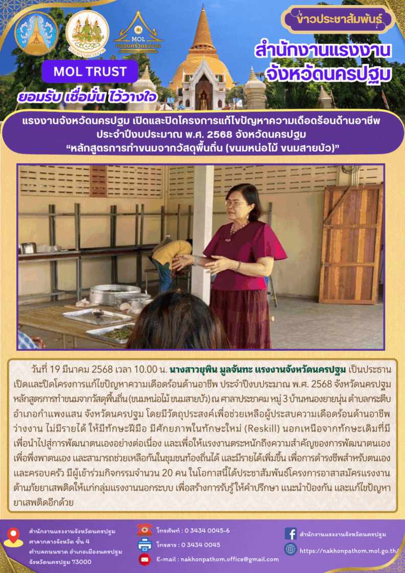 สรจ.นครปฐม เปิดและปิดโครงการแก้ไขปัญหาความเดือดร้อนด้านอาชีพ ประจำปีงบประมาณ พ.ศ. 2568 จังหวัดนครปฐม “หลักสูตรการทำขนมจากวัสดุพื้นถิ่น (ขนมหน่อไม้ ขนมสายบัว)”