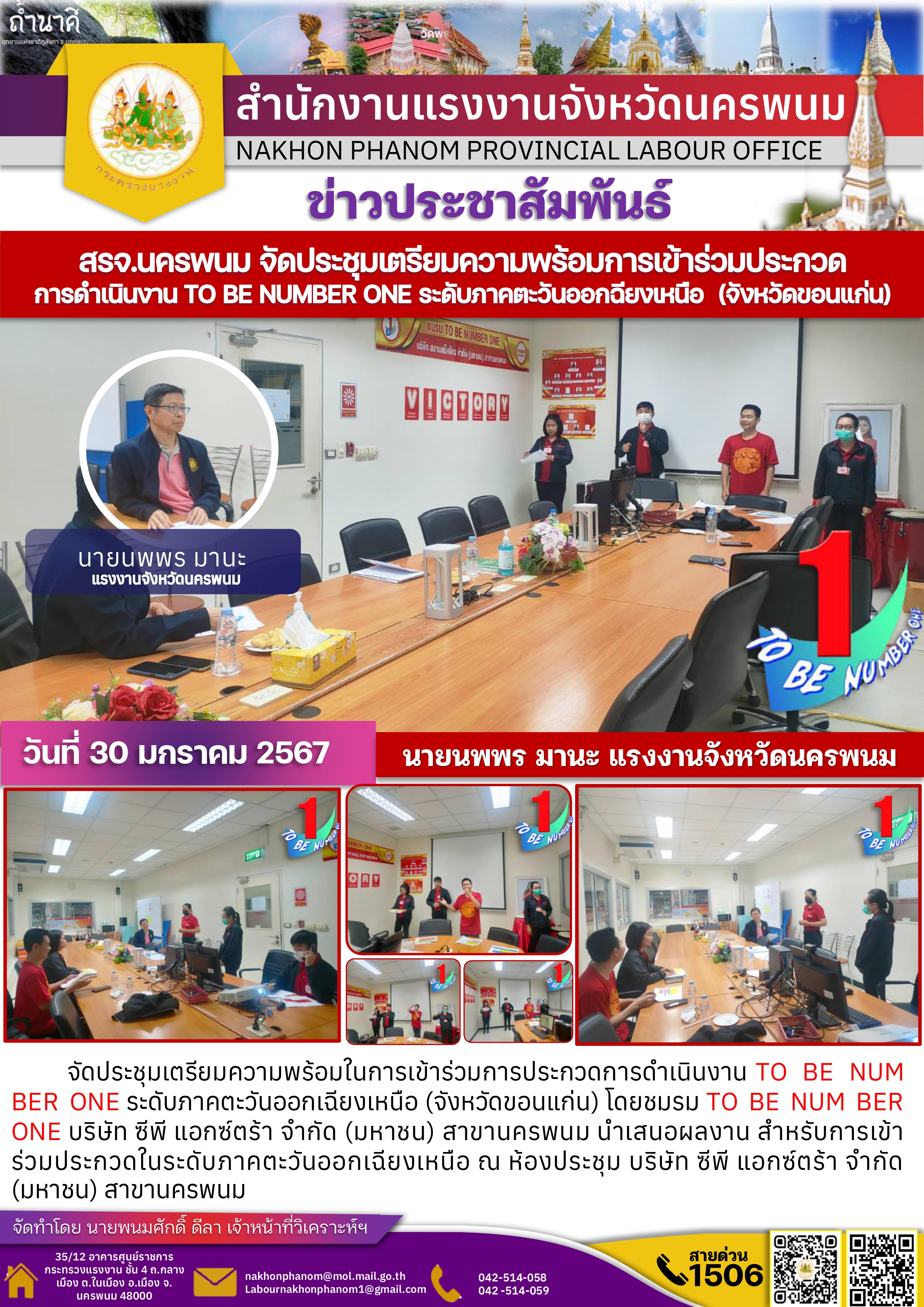 นายนพพร มานะ แรงงานจังหวัดนครพนม จัดประชุมเตรียมความพร้อมในการเข้าร่วมการประกวดการดำเนินงาน TO BE NUM BER ONE ระดับภาคตะวันออกเฉียงเหนือ (จังหวัดขอนแก่น) โดยชมรม TO BE NUM BER ONE บริษัท ซีพี แอกซ์ตร้า จำกัด (มหาชน) สาขานครพนม นำเสนอผลงาน สำหรับการเข้าร่วมประกวดในระดับภาคตะวันออกเฉียงเหนือ ณ ห้องประชุม บริษัท ซีพี แอกซ์ตร้า จำกัด (มหาชน) สาขานครพนม