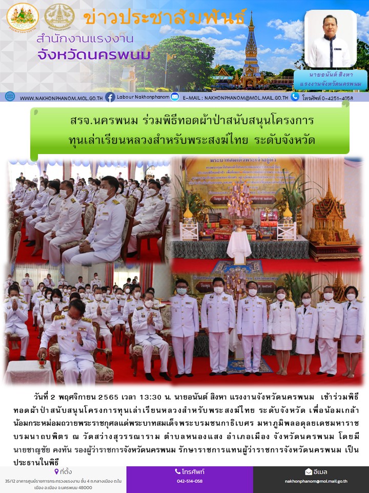 วันที่ 2 พฤศจิกายน 2565 เวลา 13:30 น. นายอนันต์ สิงหา แรงงานจังหวัดนครพนม เข้าร่วมพิธีทอดผ้าป่าสนับสนุนโครงการทุนเล่าเรียนหลวงสำหรับพระสงฆ์ไทย ระดับจังหวัด เพื่อน้อมเกล้าน้อมกระหม่อมถวายพระราชกุศลแด่พระบาทสมเด็จพระบรมชนกาธิเบศร มหาภูมิพลอดุลยเดชมหาราช บรมนาถบพิตร ณ วัดสว่างสุวรรณาราม ตำบลหนองแสง อำเภอเมือง จังหวัดนครพนม โดยมี นายชาญชัย คงทัน รองผู้ว่าราชการจังหวัดนครพนม รักษาราชการแทนผู้ว่าราชการจังหวัดนครพนม เป็นประธานในพิธี