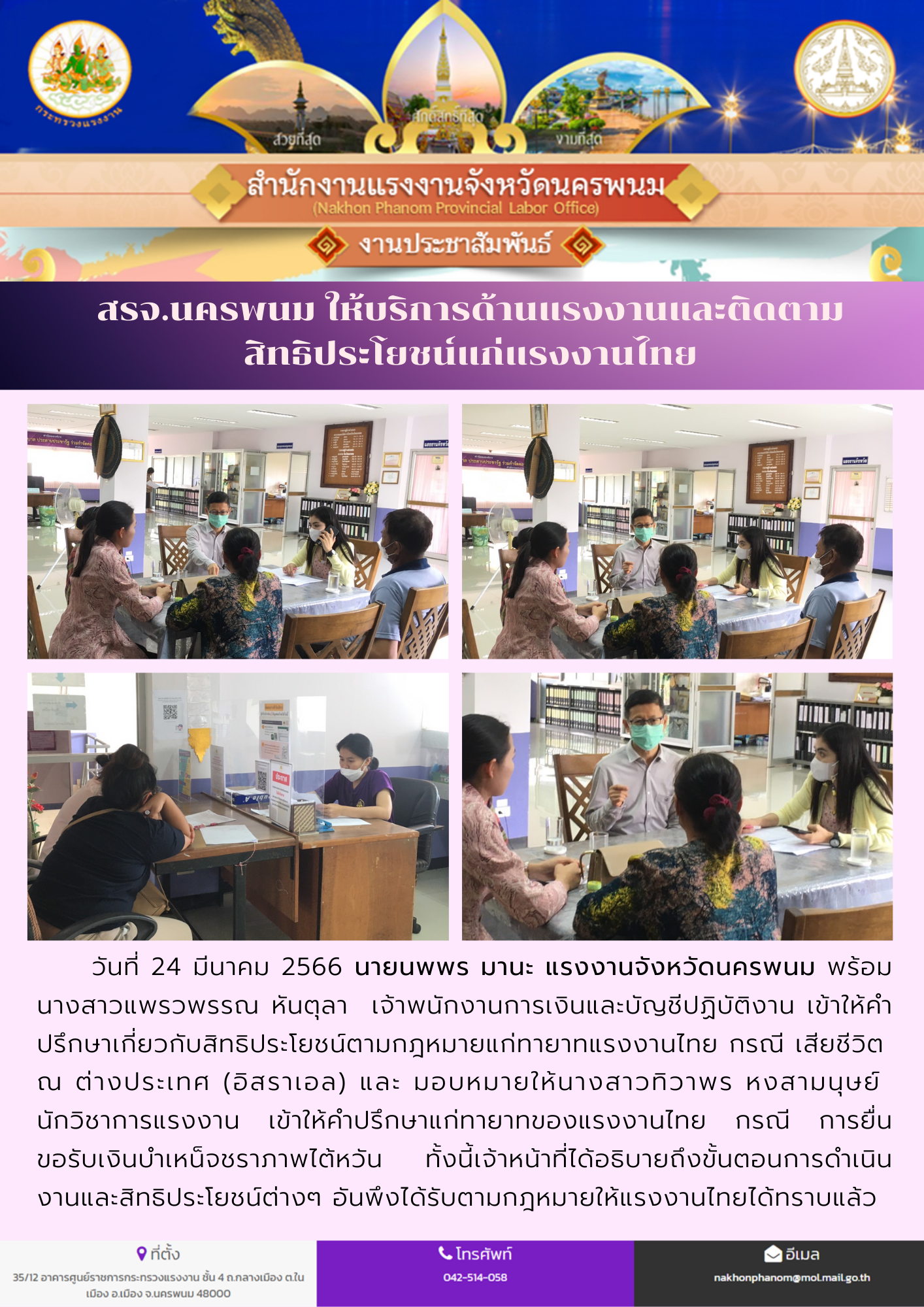 สรจ.นครพนม ให้บริการด้านแรงงานและติดตามสิทธิประโยชน์แก่แรงงานไทย