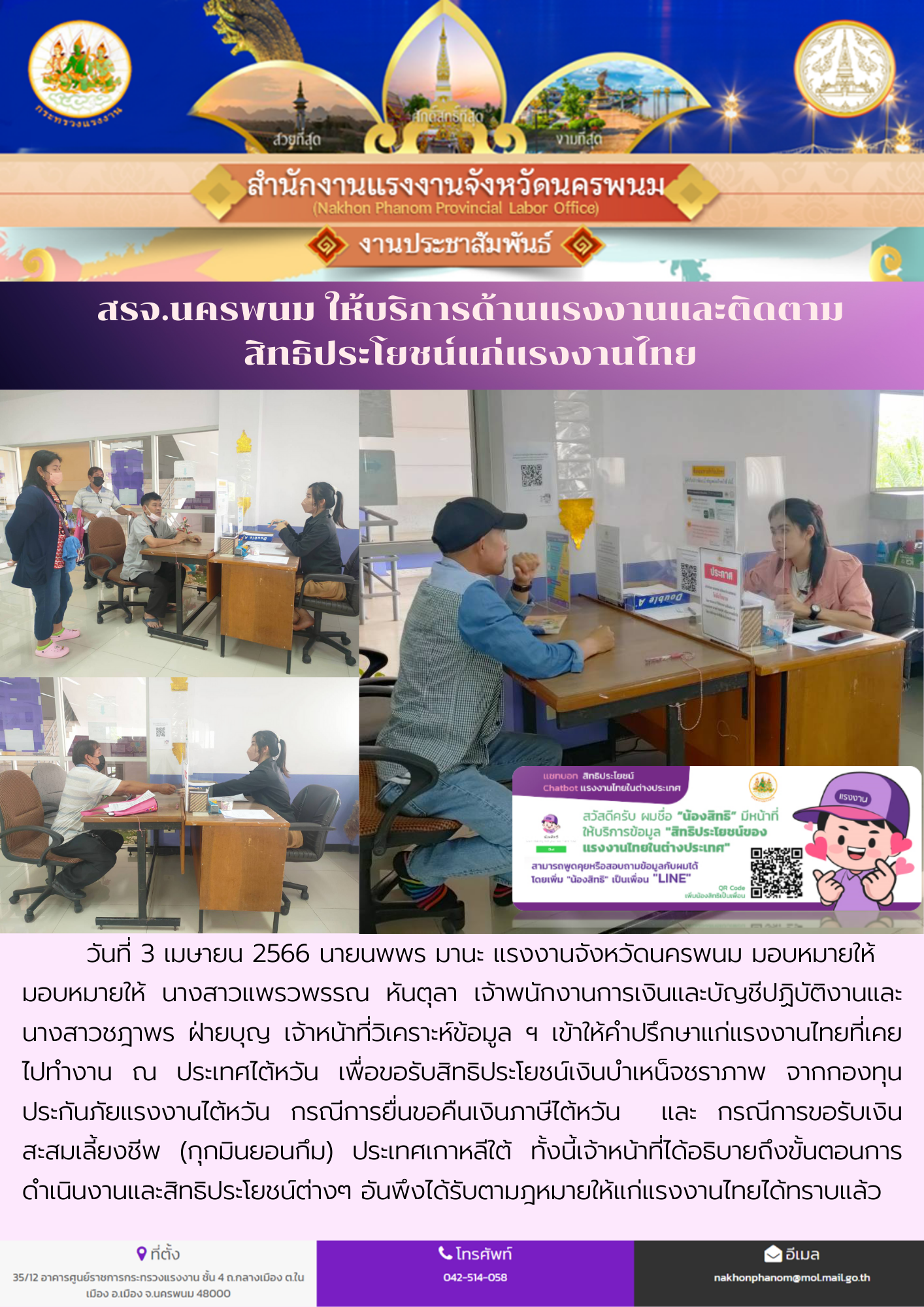 สรจ.นครพนม ให้บริการด้านแรงงานและติดตามสิทธิประโยชน์แก่แรงงานไทย