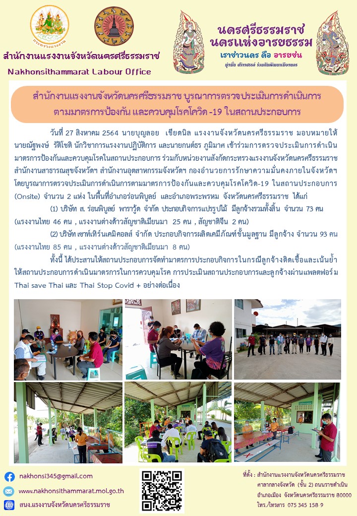 วันที่ 27 สิงหาคม 2564 นายบุญลอย เขียดนิล แรงงานจังหวัดนครศรีธรรมราช มอบหมายให้นาย ณัฐพงษ์ รัติโชติ นักวิชาการแรงงานปฏิบัติการ และนายกนต์ธร ภูมิมาศ เข้าร่วมการตรวจประเมิน เข้าร่วมการตรวจประเมินการดำเนินมาตรการป้องกันและควบคุมโรคในสถานประกอบการ ร่วมกับหน่วยงานในสังกัดกระทรวงแรงงาน โดยบูรณาการตรวจประเมินการดำเนินการตามมาตรการป้องกันและควบคุมโรคโควิด-19 ในสถานประกอบการ จำนวน 2 แห่ง ในพื้นที่อำเภอร่อนพิบูลย์ และอำเภอพระพรหม 1) บริษัท ส.ร่อนพิบูลย์ พาราวู้ด จำกัด 2) บริษัท เซาท์เทิร์นเคมิคอลล์ จำกัด