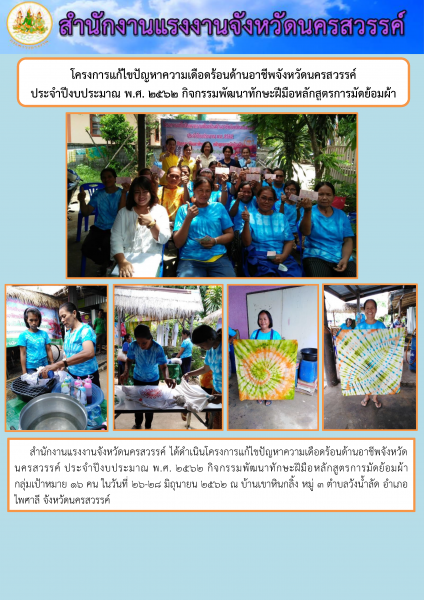 สรจ.นครสวรรค์จัดโครงการแก้ไขปัญหาความเดือดร้อนด้านอาชีพจังหวัดนครสวรรค์ ประจำปีงบประมาณ พ.ศ. 2562 กิจกรรมพัฒนาทักษะฝีมือหลักสูตรการมัดย้อมผ้า
