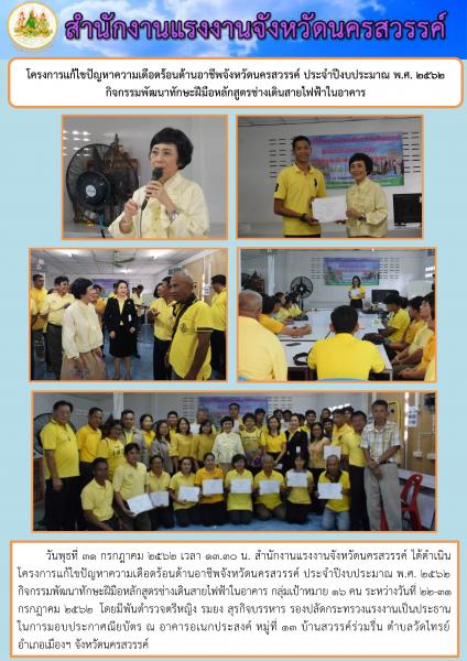 วันพุธที่ 31 กรกฎาคม 2562 เวลา 13.30 น. สำนักงานแรงงานจังหวัดนครสวรรค์ ได้ดำเนินโครงการแก้ไขปัญหาความเดือดร้อนด้านอาชีพจังหวัดนครสวรรค์ ประจำปีงบประมาณ พ.ศ. 2562 กิจกรรมพัฒนาทักษะฝีมือหลักสูตรช่างเดินสายไฟฟ้าในอาคาร กลุ่มเป้าหมาย 16 คน ระหว่างวันที่ 22-31 กรกฎาคม 2562 โดยมีพันตำรวจตรีหญิง รมยง สุรกิจบรรหาร รองปลัดกระทรวงแรงงานเป็นประธานในการมอบประกาศณียบัตร ณ อาคารอเนกประสงค์ หมู่ที่ 13 บ้านสวรรค์ร่วมรื่น ตำบลวัดไทรย์ อำเภอเมืองฯ จังหวัดนครสวรรค์