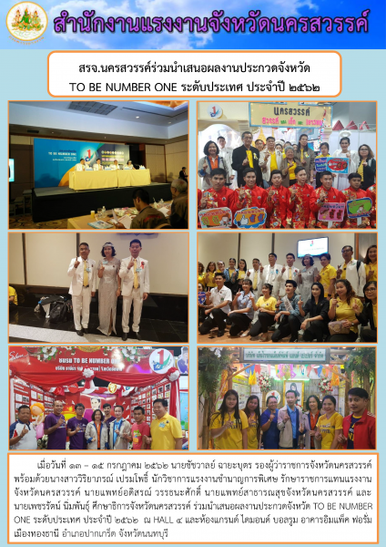เมื่อวันที่ 13 – 15 กรกฎาคม 2562 นายชัชวาลย์ ฉายะบุตร รองผู้ว่าราชการจังหวัดนครสวรรค์ พร้อมด้วยนางสาววิริยาภรณ์ เปรมโพธิ์ นักวิชาการแรงงานชำนาญการพิเศษ รักษาราชการแทนแรงงานจังหวัดนครสวรรค์ นายแพทย์อดิสรณ์ วรรธนะศักดิ์ นายแพทย์สาธารณสุขจังหวัดนครสวรรค์ และ นายเพชรรัตน์ นิ่มพันธุ์ ศึกษาธิการจังหวัดนครสวรรค์ ร่วมนำเสนอผลงานประกวดจังหวัด TO BE NUMBER ONE ระดับประเทศ ประจำปี 2562 ณ HALL 4 และห้องแกรนด์ ไดมอนด์ บอลรูม อาคารอิมแพ็ค ฟอรั่ม เมืองทองธานี อำเภอปากเกร็ด จังหวัดนนทบุรี