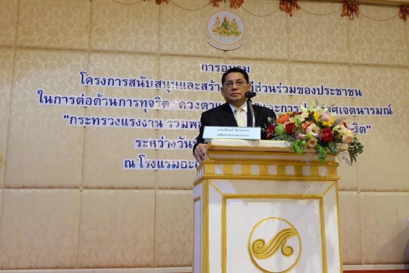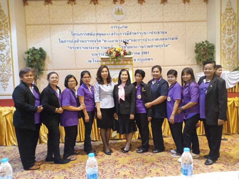 วันที่ 11 ธันวาคม 2561 ณ ณ โรงแรม อะเดรียติค พาเลซ กรุงเทพ : นางประภาพร อัมรินทร์นุเคราะห์ นักวิชาการแรงงานชำนาญการ ผู้แทนแรงงานจังหวัดนนทบุรี นำทีมอาสาสมัครแรงงานจังหวัดนนทบุรี ร่วมพิธีเปิดโครงการสนับสนุนและสร้างการมีส่วนร่วมของประชาชนในการต่อต้านการทุจริต “ดวงตาแรงงาน” โดยมีนายจรินทร์ จักกะพาก ปลัดกระทรวงแรงงาน เป็นประธานในพิธีเปิดโครงการฯ และนำกล่าวประกาศเจตนารมณ์ “กระทรวงแรงงาน รวมพลังเครือข่ายแรงงานร่วมต้านทุจริต” กิจกรรมดังกล่าวจัดขึ้นระหว่างวันที่ 11 – 13 ธันวาคม 2561 ซึ่งมีวัตถุประสงค์เพื่อสร้างกลไกการมีส่วนร่วมของประชาชน อาสาสมัครแรงงาน สถานประกอบกิจการ และผู้ใช้แรงงานในการเป็นเครือข่ายเฝ้าระวังป้องกัน และปิดกั้นโอกาสในการทุจริตในระดับพื้นที่ รวมถึงเป็นการอบรมให้ความรู้และปลูกจิตสำนึกเกี่ยวกับการป้องกัน ปราบปรามการทุจริต ทั้งนี้เมื่อเครือข่ายการมีส่วนร่วมได้ผ่านการอบรม จะทำให้เกิดความร่วมมือในการทำงานร่วมกัน เพื่อสร้างชาติ พัฒนาที่มีคุณธรรม เพื่อแก้ไขปัญหาการทุจริตคอร์รัปชันให้หมดไปจากสังคมไทยต่อไป