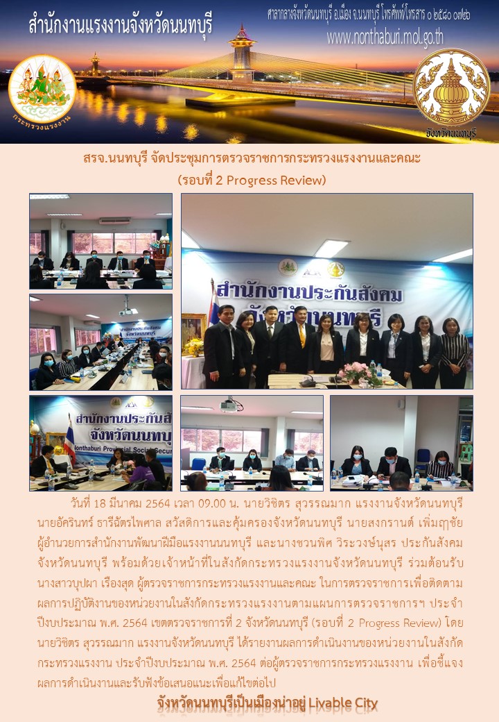 วันที่ 18 มีนาคม 2564 เวลา 09.00 น. นายวิชิตร สุวรรณมาก แรงงานจังหวัดนนทบุรี นายอัครินทร์ ธารีฉัตรไพศาล สวัสดิการและคุ้มครองจังหวัดนนทบุรี นายสงกรานต์ เพิ่มฤๅชัย ผู้อำนวยการสำนักงานพัฒนาฝีมือแรงงานนนทบุรี และนางชวนพิศ วิระวงษ์นุสร ประกันสังคมจังหวัดนนทบุรี พร้อมด้วยเจ้าหน้าที่ในสังกัดกระทรวงแรงงานจังหวัดนนทบุรี ร่วมต้อนรับนางสาวบุปผา เรืองสุด ผู้ตรวจราชการกระทรวงแรงงานและคณะ ในการตรวจราชการเพื่อติดตามผลการปฏิบัติงานของหน่วยงานในสังกัดกระทรวงแรงงานตามแผนการตรวจราชการฯ ประจำปีงบประมาณ พ.ศ. 2564 เขตตรวจราชการที่ 2 จังหวัดนนทบุรี (รอบที่ 2 Progress Review) โดยนายวิชิตร สุวรรณมาก แรงงานจังหวัดนนทบุรี ได้รายงานผลการดำเนินงานของหน่วยงานในสังกัดกระทรวงแรงงาน ประจำปีงบประมาณ พ.ศ. 2564 ต่อผู้ตรวจราชการกระทรวงแรงงาน เพื่อชี้แจงผลการดำเนินงานและรับฟังข้อเสนอแนะเพื่อแก้ไขต่อไป