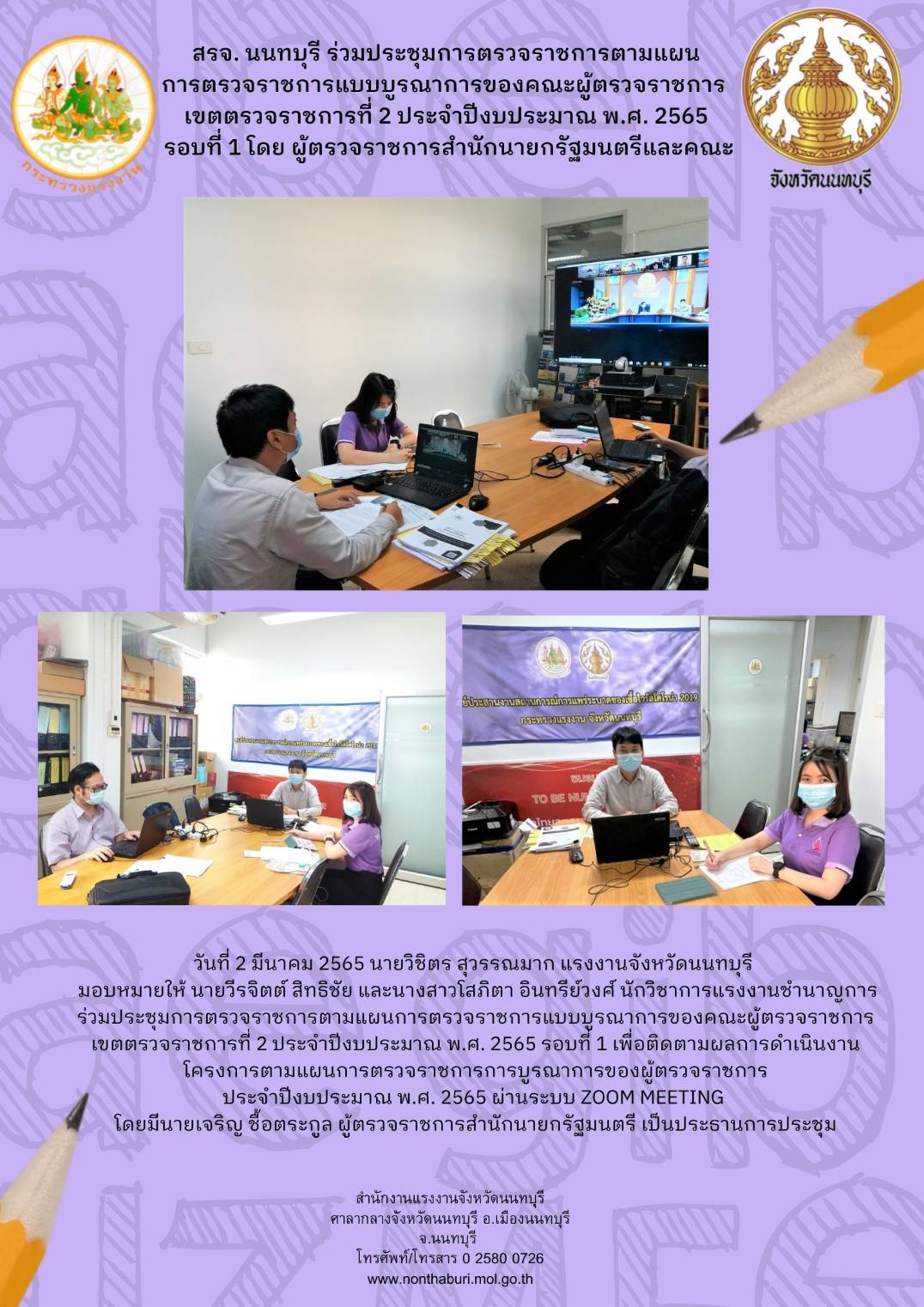 วันที่ 2 มีนาคม 2565 นายวิชิตร สุวรรณมาก แรงงานจังหวัดนนทบุรี มอบหมายให้ นายวีรจิตต์ สิทธิชัย และนางสาวโสภิตา อินทรีย์วงศ์ นักวิชาการแรงงานชำนาญการ ร่วมประชุมการตรวจราชการตามแผนการตรวจราชการแบบบูรณาการของคณะผู้ตรวจราชการ เขตตรวจราชการที่ 2 ประจำปีงบประมาณ พ.ศ. 2565 รอบที่ 1 เพื่อติดตามผลการดำเนินงานโครงการตามแผนการตรวจราชการการบูรณาการของผู้ตรวจราชการ ประจำปีงบประมาณ พ.ศ. 2565 ผ่านระบบ ZOOM MEETING โดยมีนายเจริญ ชื้อตระกูล ผู้ตรวจราชการสำนักนายกรัฐมนตรี เป็นประธานการประชุม