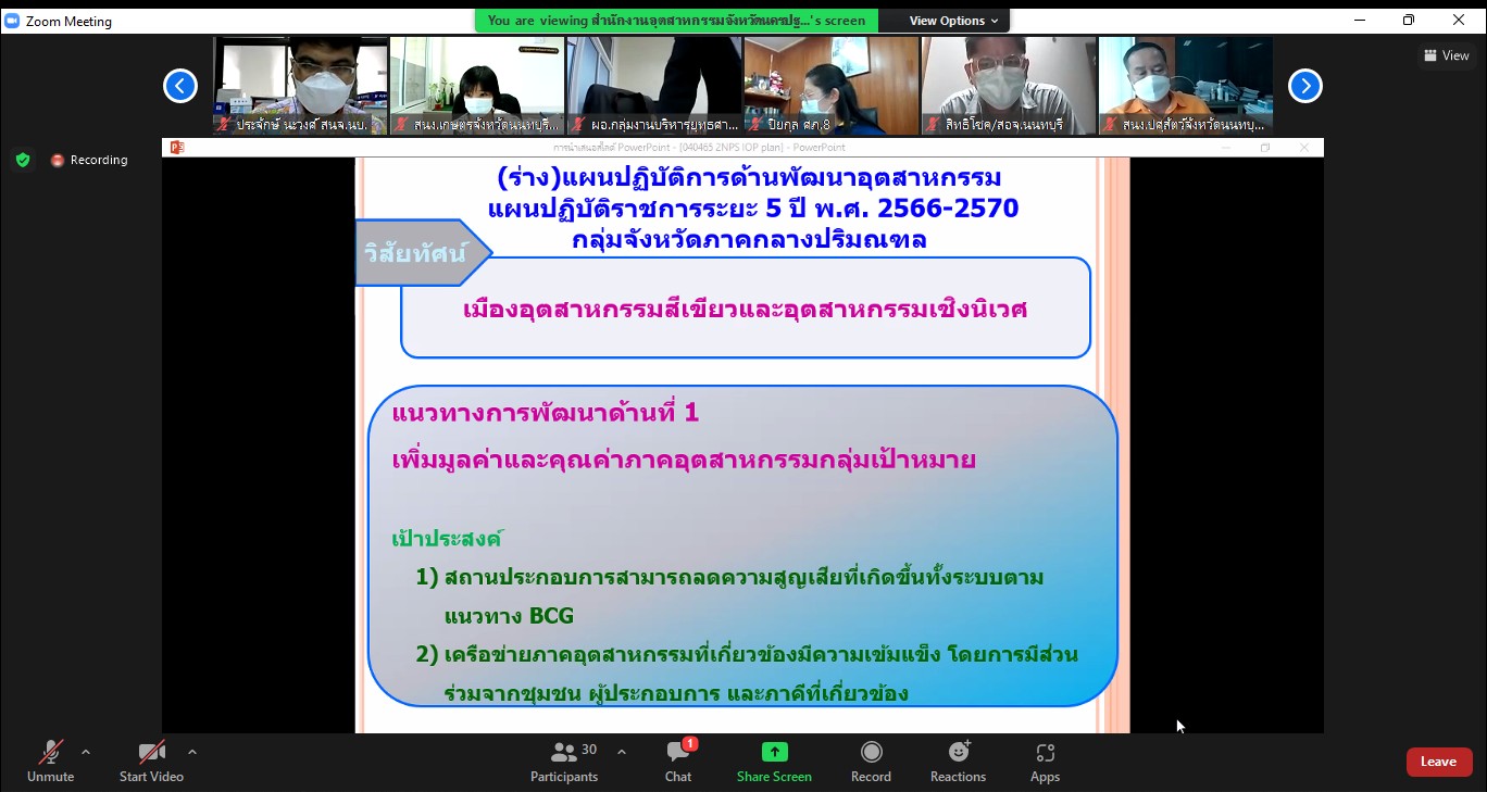 วันที่ 7 เมษายน 2565 เวลา 09.00น. นายวิชิตร สุวรรณมาก แรงงานจังหวัดนนทบุรี มอบหมายให้ นายวีรจิตต์ สิทธิชัย นักวิชาการแรงงานชำนาญการ ร่วมประชุมเชิงปฏิบัติการจัดทำแผนปฏิบัติการด้านการพัฒนาอุตสาหกรรมกลุ่มจังหวัดภาคกลางและปริมณฑลระยะ 5 ปี เพื่อกำหนดแนวทางการจัดทำแผนยุทธศาสตร์การพัฒนาอุตสาหกรรมและเป็นส่วนร่วมในการขับเคลื่อนอุตสาหกรรมที่สำคัญให้สอดคล้องตามเป้าหมายแผนพัฒนาจังหวัดนนทบุรี ผ่านระบบ Zoom Meeting