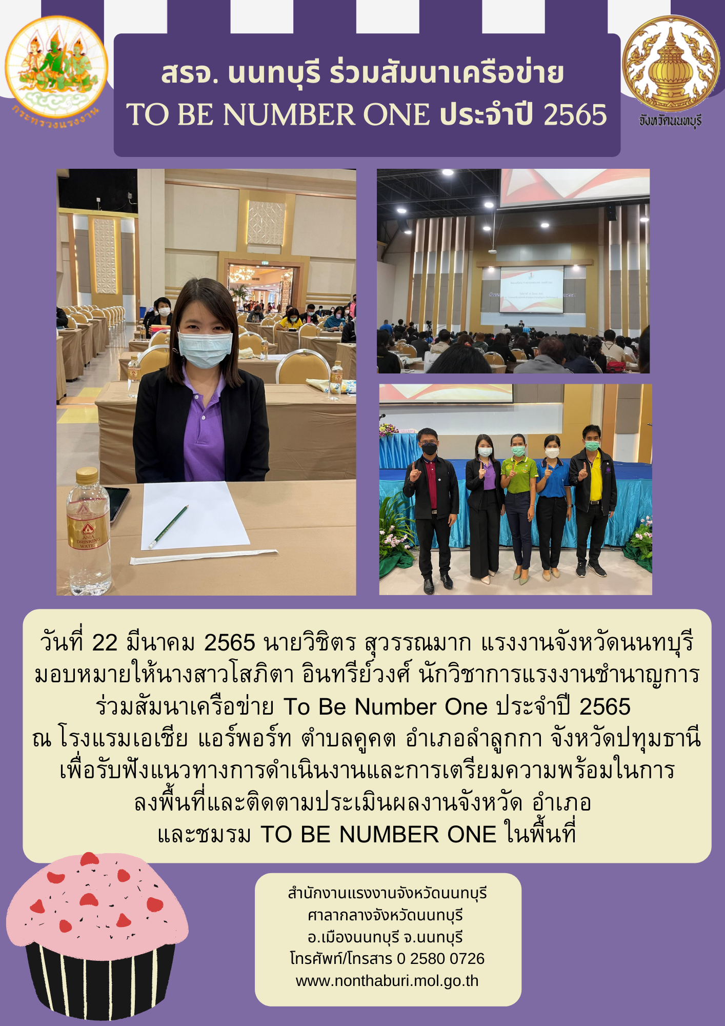 วันที่ 22 มีนาคม 2565 นายวิชิตร สุวรรณมาก แรงงานจังหวัดนนทบุรี มอบหมายให้นางสาวโสภิตา อินทรีย์วงศ์ นักวิชาการแรงงานชำนาญการ ร่วมสัมมนาเครือข่าย To Be Number One ประจำปี 2565 ณ โรงแรมเอเชีย แอร์พอร์ท ตำบลคูคต อำเภอลำลูกกา จังหวัดปทุมธานี เพื่อรับฟังแนวทางการดำเนินงานและการเตรียมความพร้อมในการลงพื้นที่และติดตามประเมินผลงานจังหวัด อำเภอ และชมรม TO BE NUMBER ONE ในพื้นที่