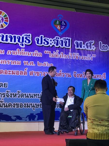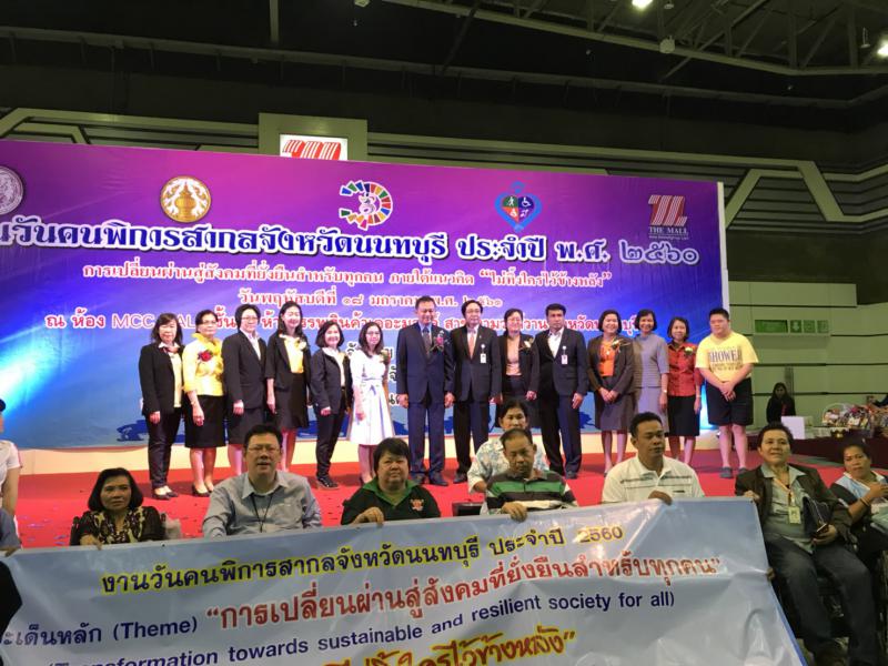 วันพฤหัสบดีที่ 18 มกราคม 2561เวลา 11.00 น. ณ ห้อง MCC Hall ห้างสรรพสินค้าเดอะมอลล์ สาขางามวงศ์วาน : นางกัญจนาภรณ์ ไซกัล แรงงานจังหวัดนนทบุรี ได้มอบหมายให้ข้าราชการในสำนักงานแรงงานจังหวัดนนทบุรีเข้าร่วมพิธีเปิดงานวันคนพิการสากล ประจำปี พ.ศ. 2560 โดยกิจกรรมในครั้งนี้มีนายชลธี ยังตรง รองผู้ว่าราชการจังหวัดนนทบุรี เป็นประธานในการเปิดงาน ทั้งนี้กิจกรรมดังกล่าวได้มีกิจกรรมต่างๆ ประกอบด้วยการเดินรณรงค์ประชาสัมพันธ์ การจัดบอร์ดนิทรรศการแสดงผลงานจากหน่วยงานภาครัฐ ภาคเอกชน และหน่วยงานด้านคนพิการ การฝึกอาชีพระยะสั้น การบริการซ่อมรถเข็น กายอุปกรณ์ เป็นต้น